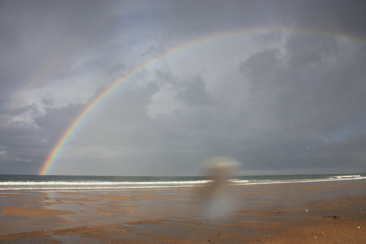 Op deze foto van een regenboog op de Noordzee kun je duidelijk een draaiende/wervelende Ufo zien die uit Venus komt. Schitterend toch!