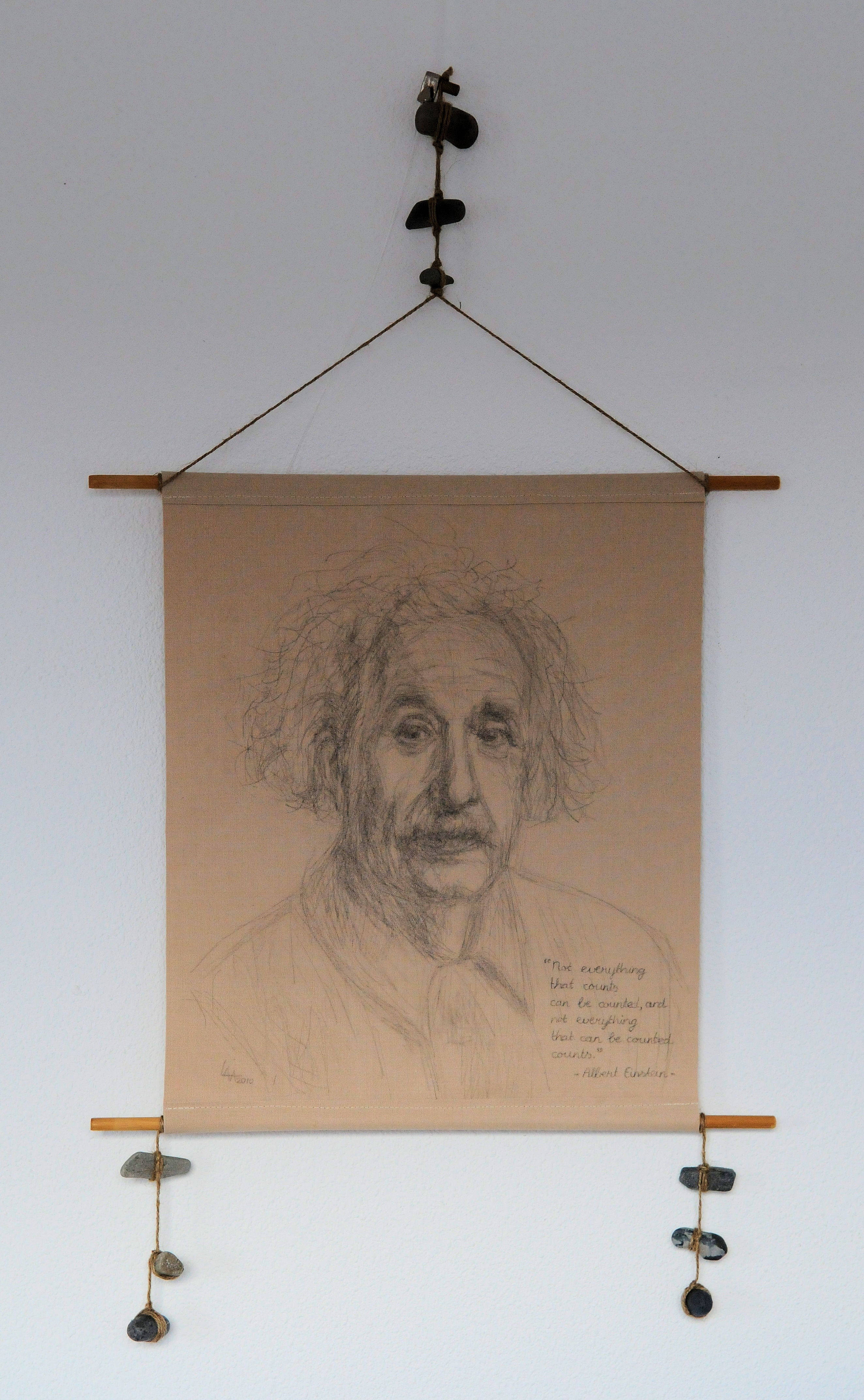 Portrettekening en citaat van Einstein op zeildoek. Voorzien van zelfbedacht ophangmechanisme met hout, touw en steentjes.(installatie)