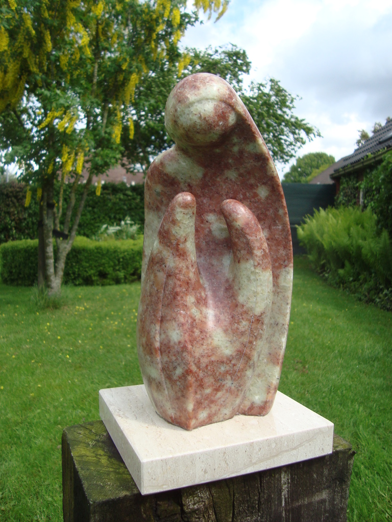 Een ingetogen beeld van een rood gemêleerde Braziliaanse Speksteen op een ivoorkleurige marmeren sokkel. Het verbeeldt de koestering, bescherming van een moederfiguur en twee kinderen.