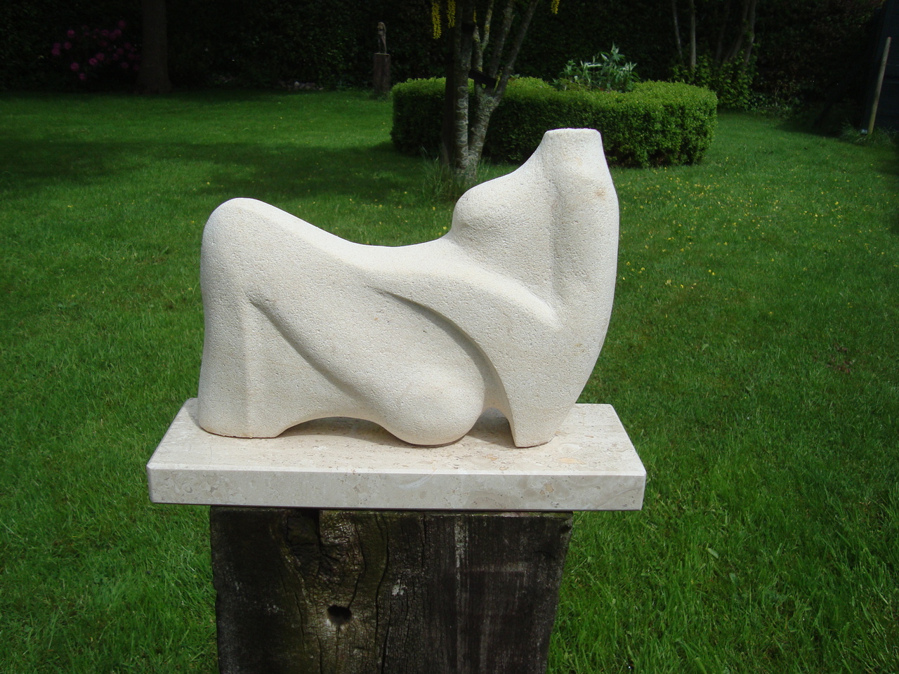 Dit beeld, gemaakt uit Franse Kalksteen op een marmeren sokkel, geeft het ultieme gevoel van ontspanning, van luieren op het strand, het is goed zoals het is!