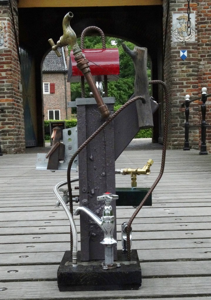 Kranen vliegen niet: Kranen vliegen niet / als ze vastzitten. // Dat is de functie / van een goede installatie. // Indien uitbesteed aan een prutser / pakt dat anders uit / en volgen gaten in het plafond / lekkage / en vallende drek uit de lucht. Assemblage, hout, gips, metaal, verf. Foto bij ingang van het fraaie kasteel van Doorwerth (Gld)