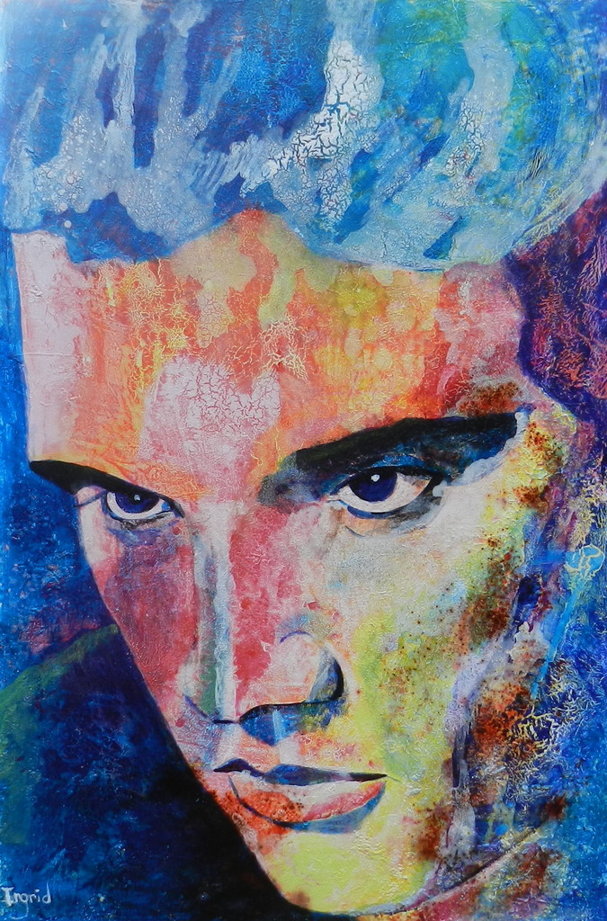 Portret van Elvis Presley, uitgevoerd in mixed media op linnen.