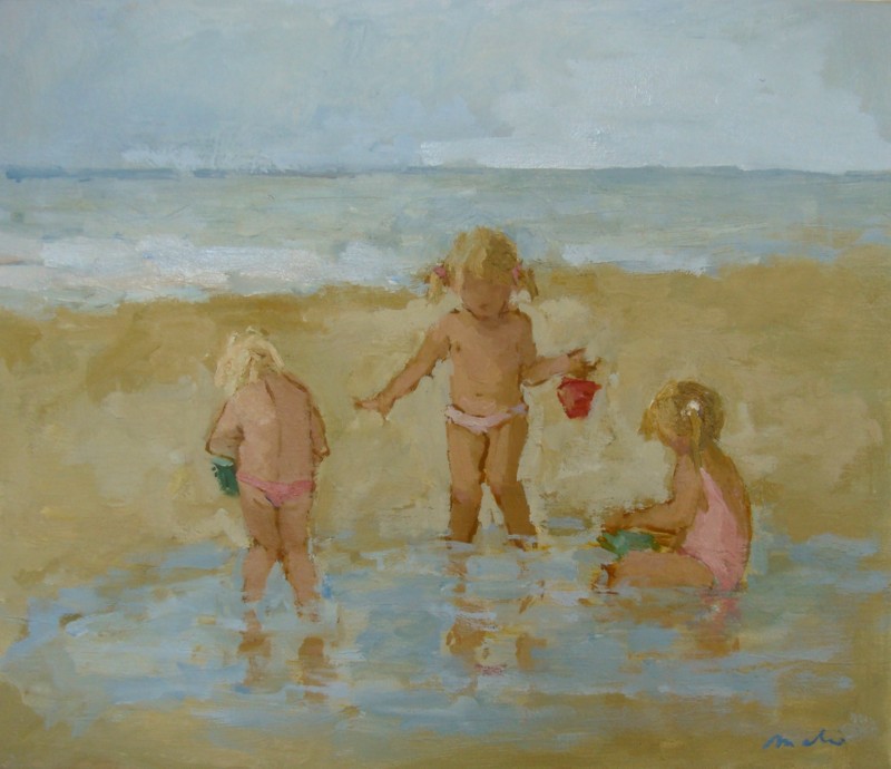 Verkocht. Drie kleine meisjes spelend aan zee.