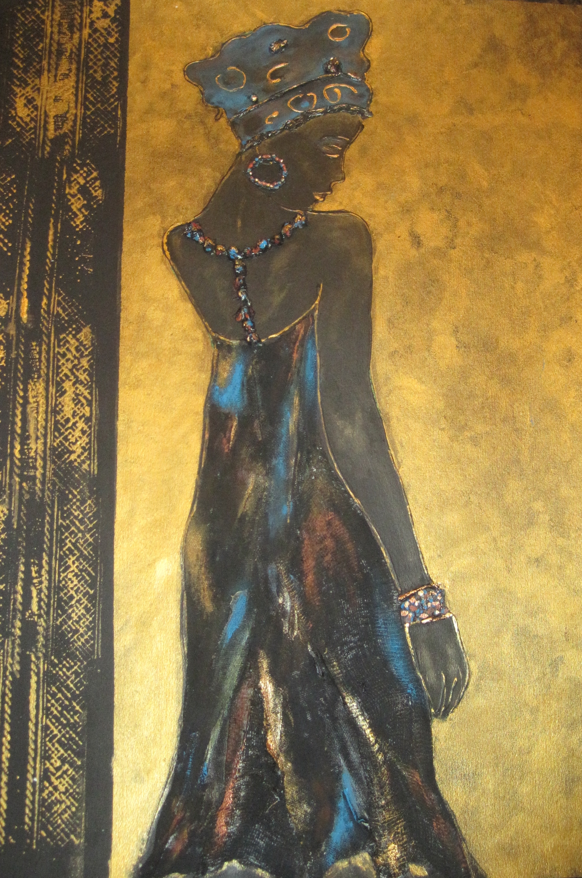 Afrikaanse dame met 3-D effecten, papier, kralen en glasverf dik opgezet