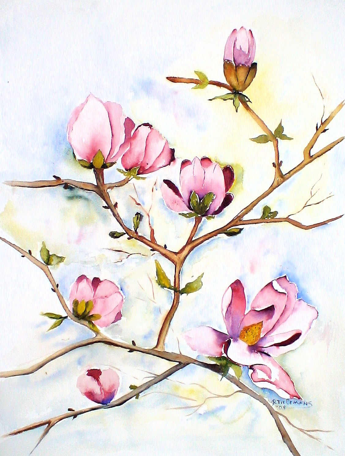 Wit Figuratief Rood Groen Bruin Papier Aquarel Realistisch Natuur Bloem Red Green Roze Plant White Brown Flower Paper Figurative Watercolor Pink Magnolia Nature Realistic