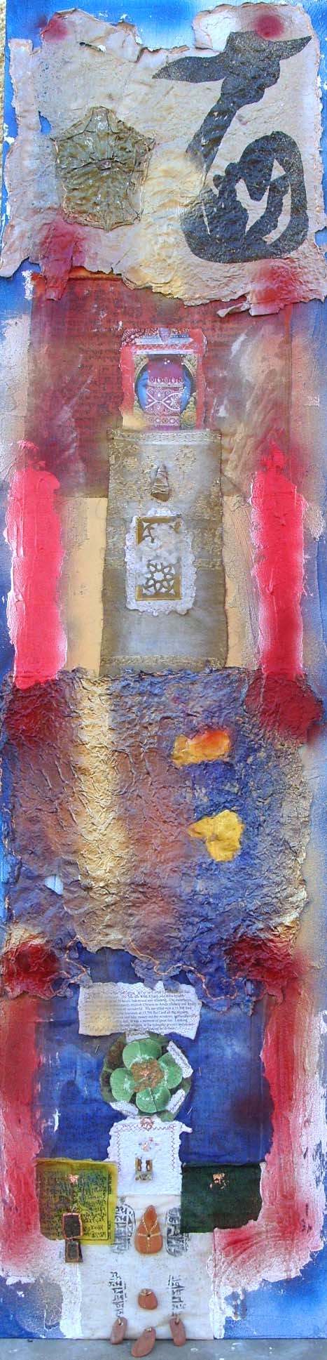Een totem paneel met wenskracht, de taoistische slang op handgeschept papier,handgeschept papier met voorwerpen erin verwerkt, steentjes met gouddraad,verborgen teksten, onderin afdrukken van een mantra.
