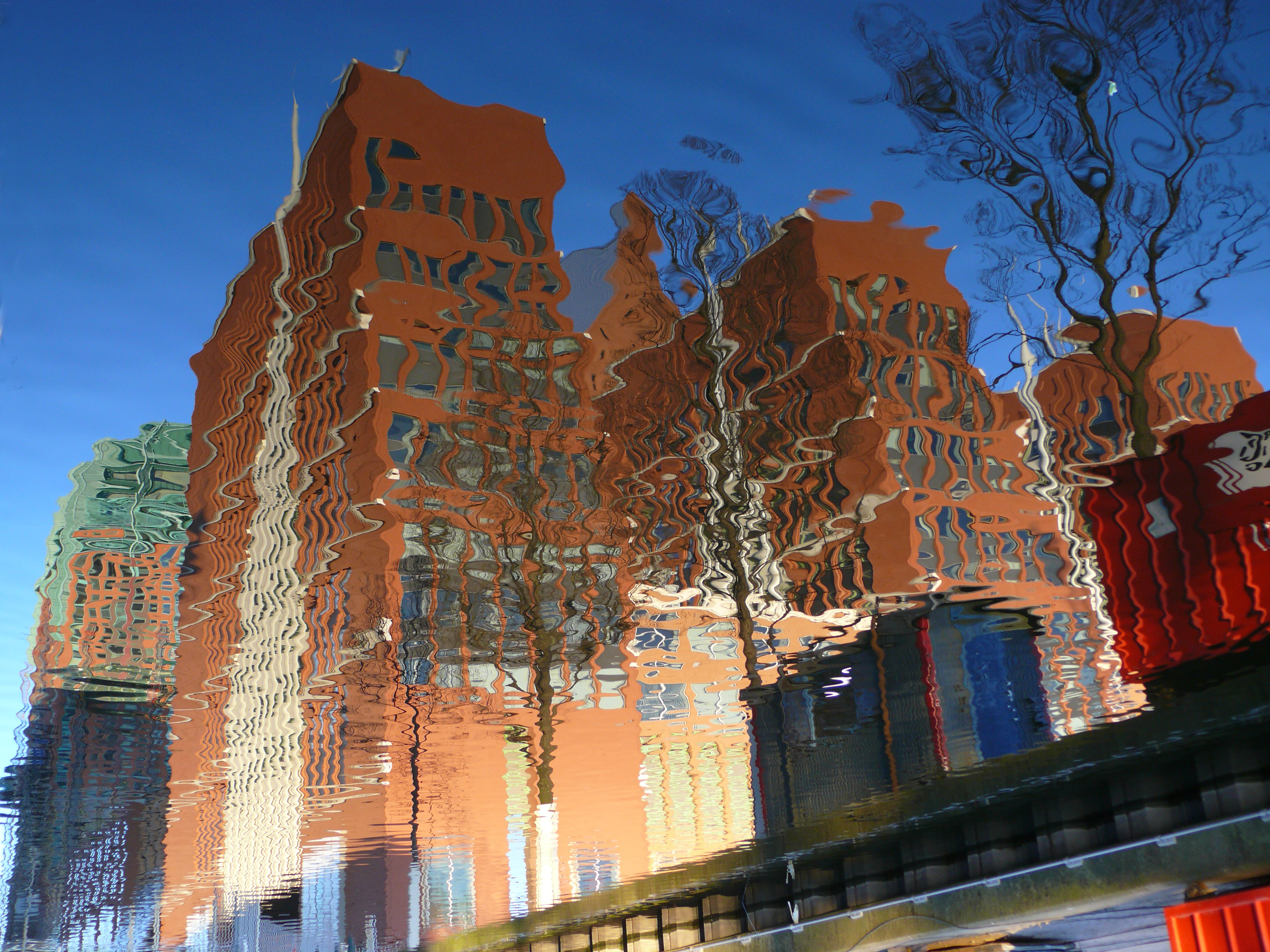 Spiegeling in de gracht van gebouwen aan het Zwarte water (Den Haag).