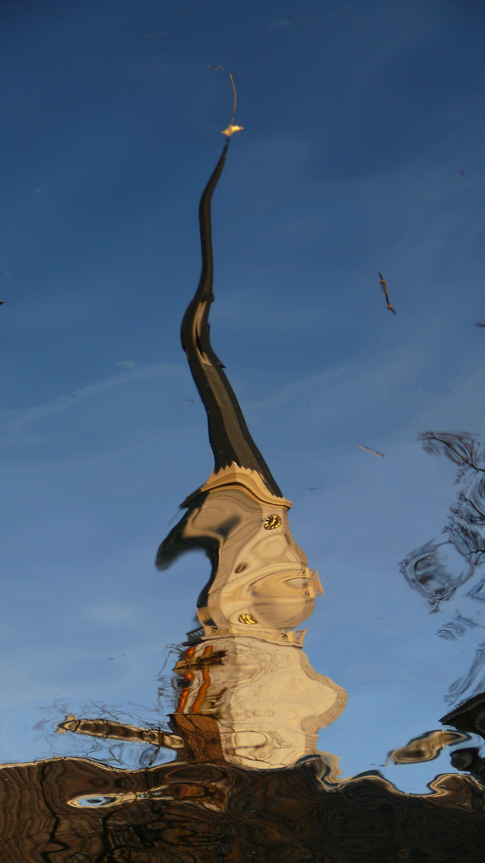 Waterspiegeling als gezicht van de toren van de Koninklijke stallen in Den Haag.