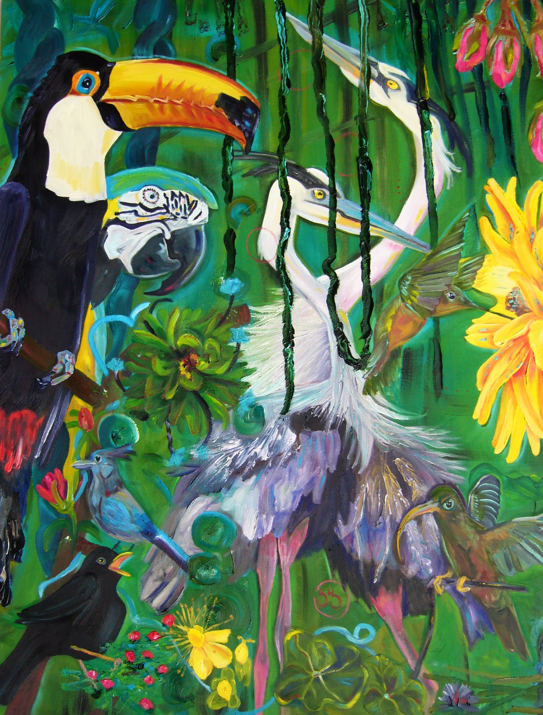 Surreel Geel Groen Kleuren Olieverf Bos Birds Vogels Muziek Dansen Painted Oerwoud Naief Orkest Snavels Twitter Twitteren