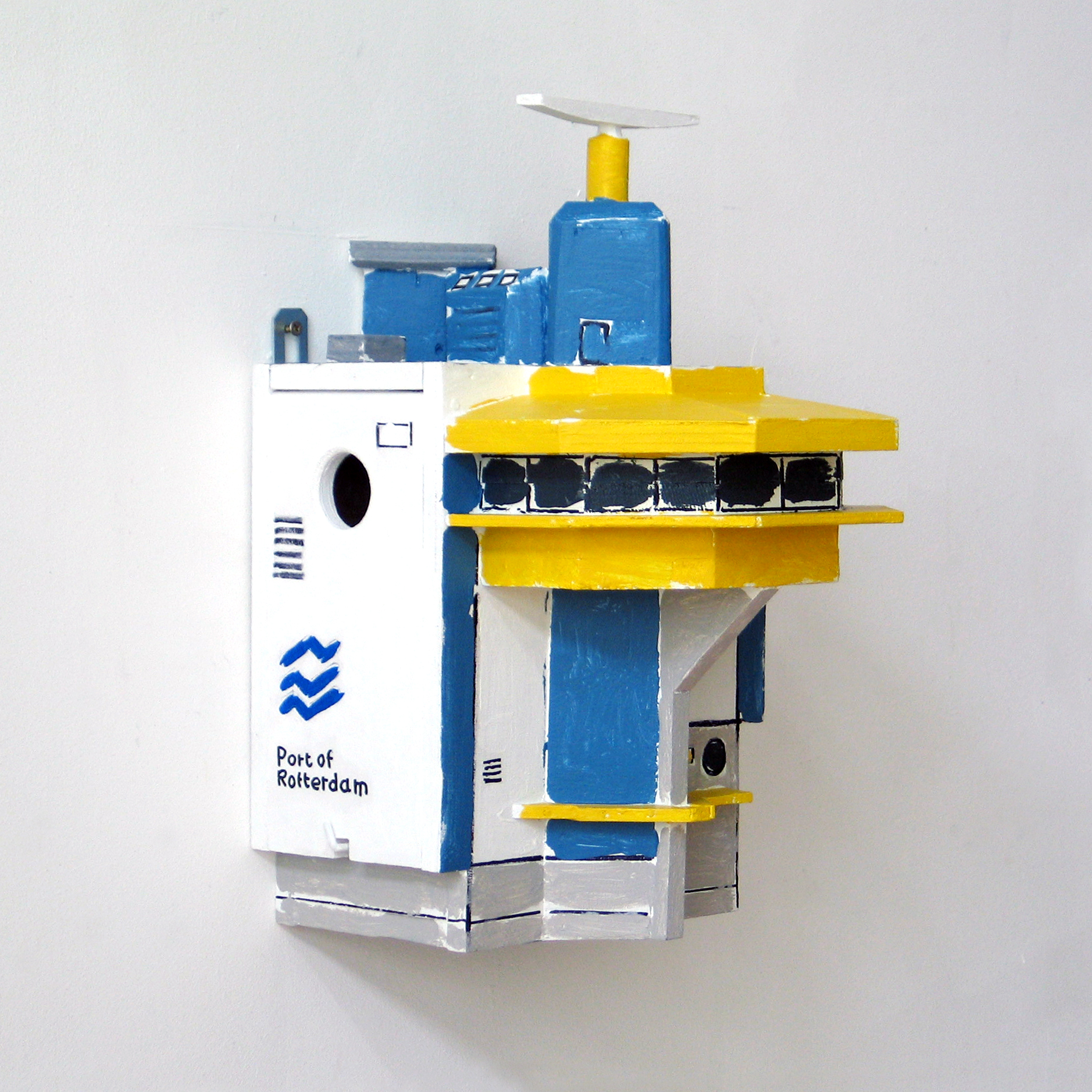 Nestkast voor kleine vogels zoals mezen. De nestkast is gemaakt naar een radarpost aan de Maasboulevard in Rotterdam.