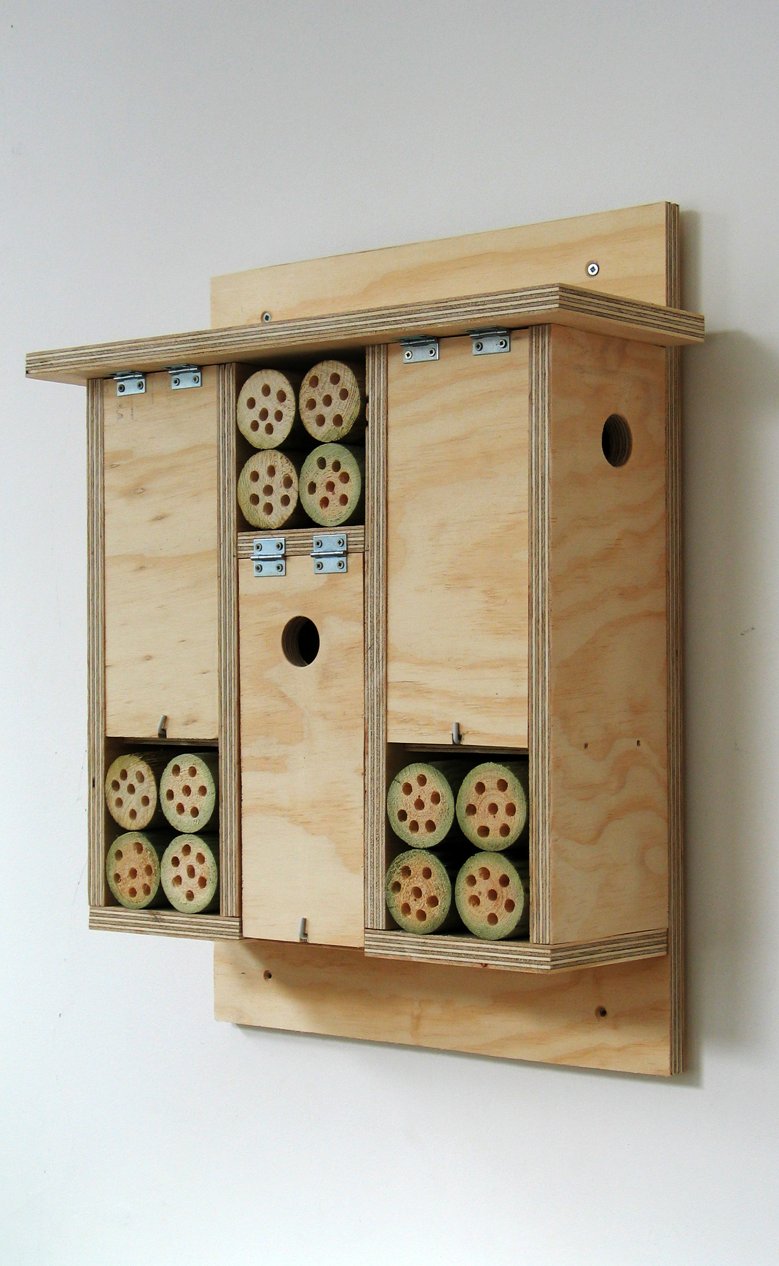 Gecombinerde nestkast voor kleine vogels en insecten. Er zijn drie compartimenten voor vogels waardoor deze kast ook geschikt is voor mussen.
