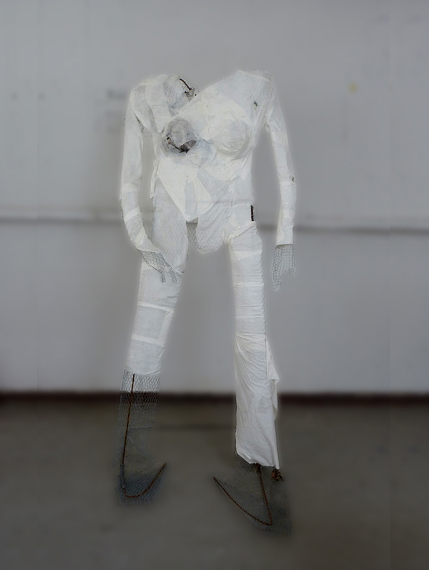 Betonijzer, kippengaas, houtlijm en lakenkatoen.