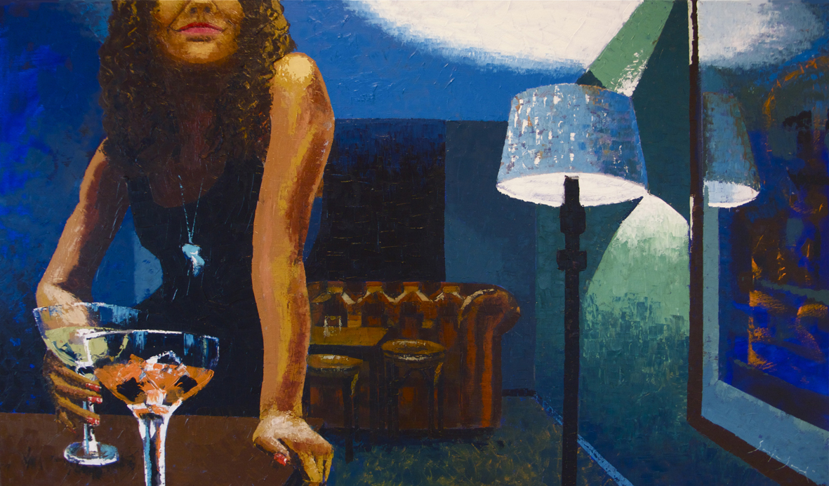 Blauw Vrouw Kleurrijk Realistisch Olieverf Paletmes Bar Uitgaan Date Cocktails Proost