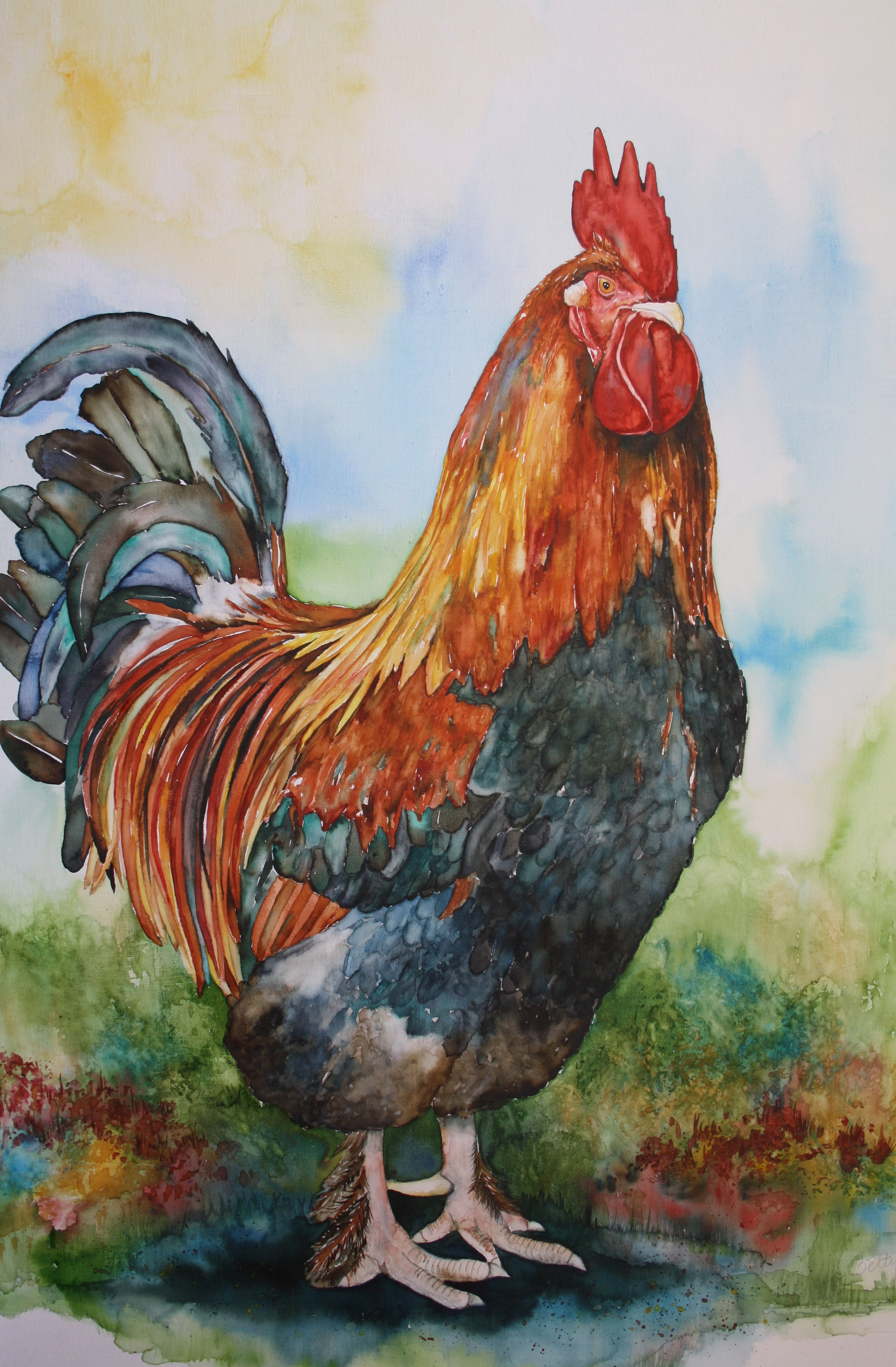 Meneer de Haan. Aquarel van een Maran Haan in al zijn pracht en praal. Aquarel door speciale techniek geschilderd op doek.
