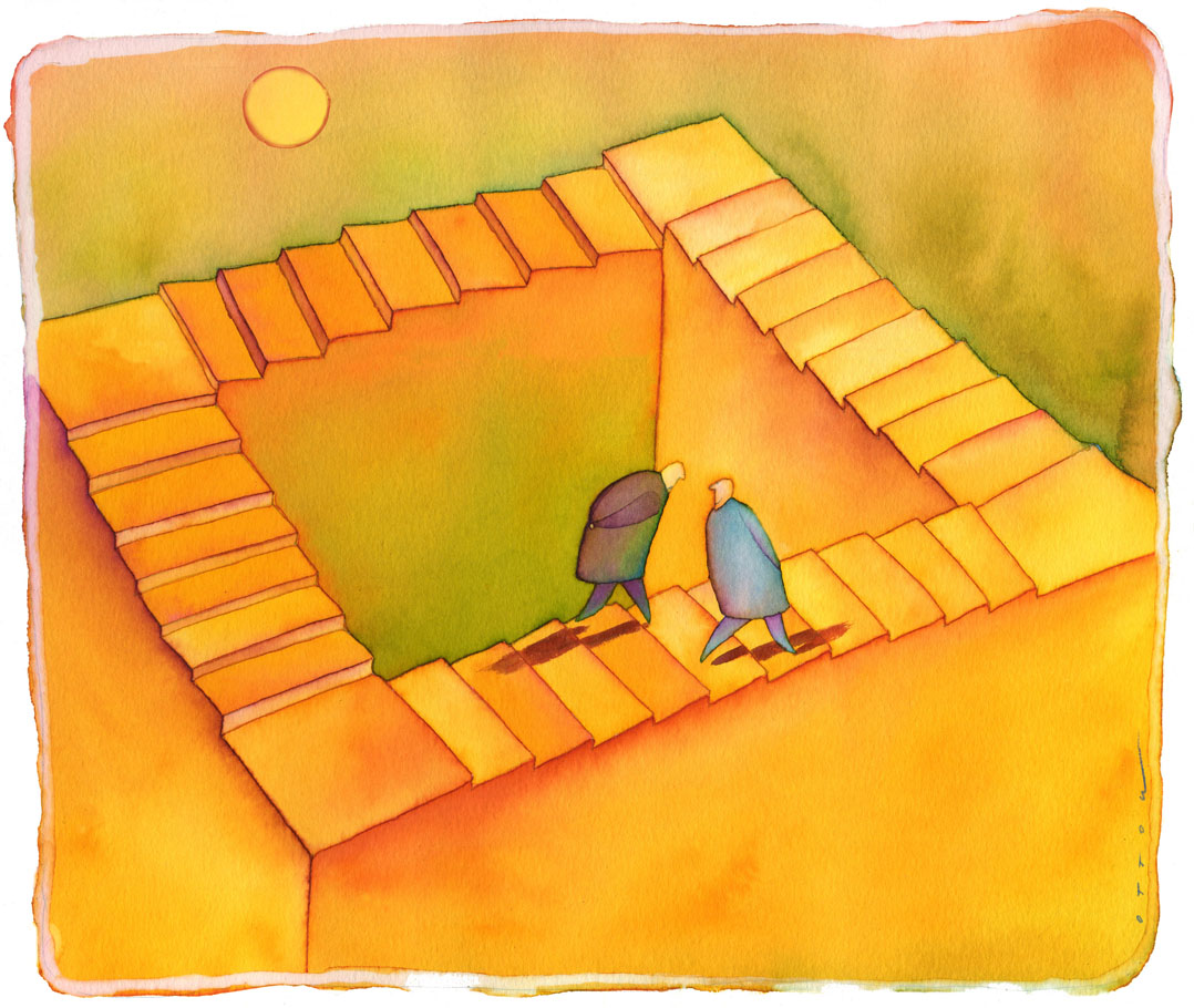 Met dank aan Escher, de optimist kijkt naar boven en de pessimist naar beneden. Er blijft een keuze