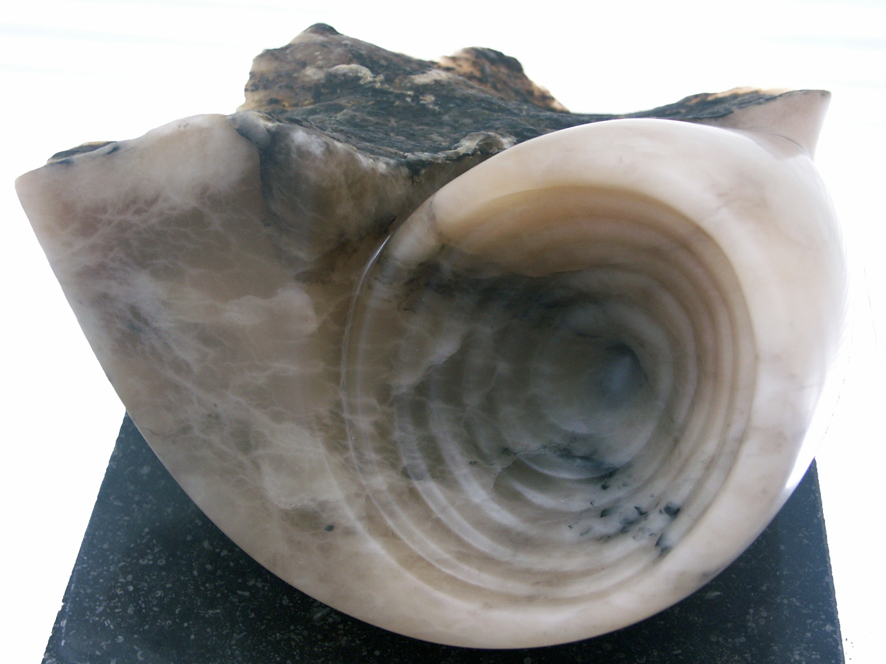 De achterkant van het beeld heeft een 'Brancusi-vorm' die zich transformeert in een schelp. Mooi contrast tussen het lichte gladde gepolijste gedeelte en het donkere onbewerkte, ruwe deel van het albast.