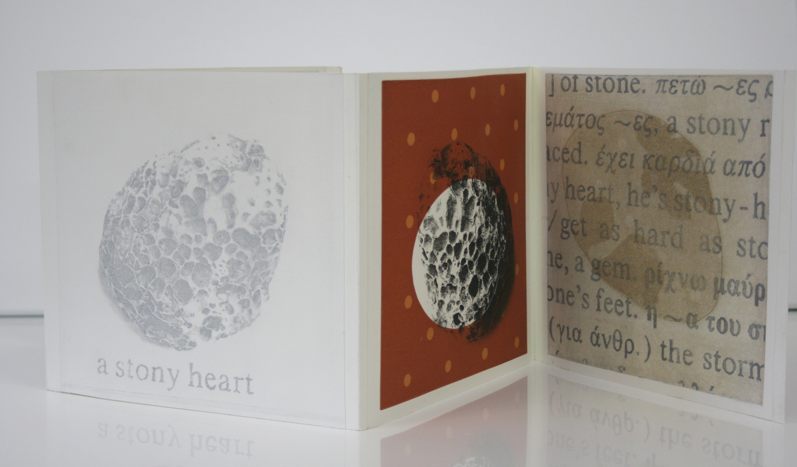 Boek bestaat uit 10 prenten met eenzelfde thema; a heart of stone.Leporello, combinatie van blinddruk, foto-ets en linodruk. Zonder cover, op zich zelf staand. Thema is telkens dezelfde steen, als wezen en universum. Klein en groots tegelijk.