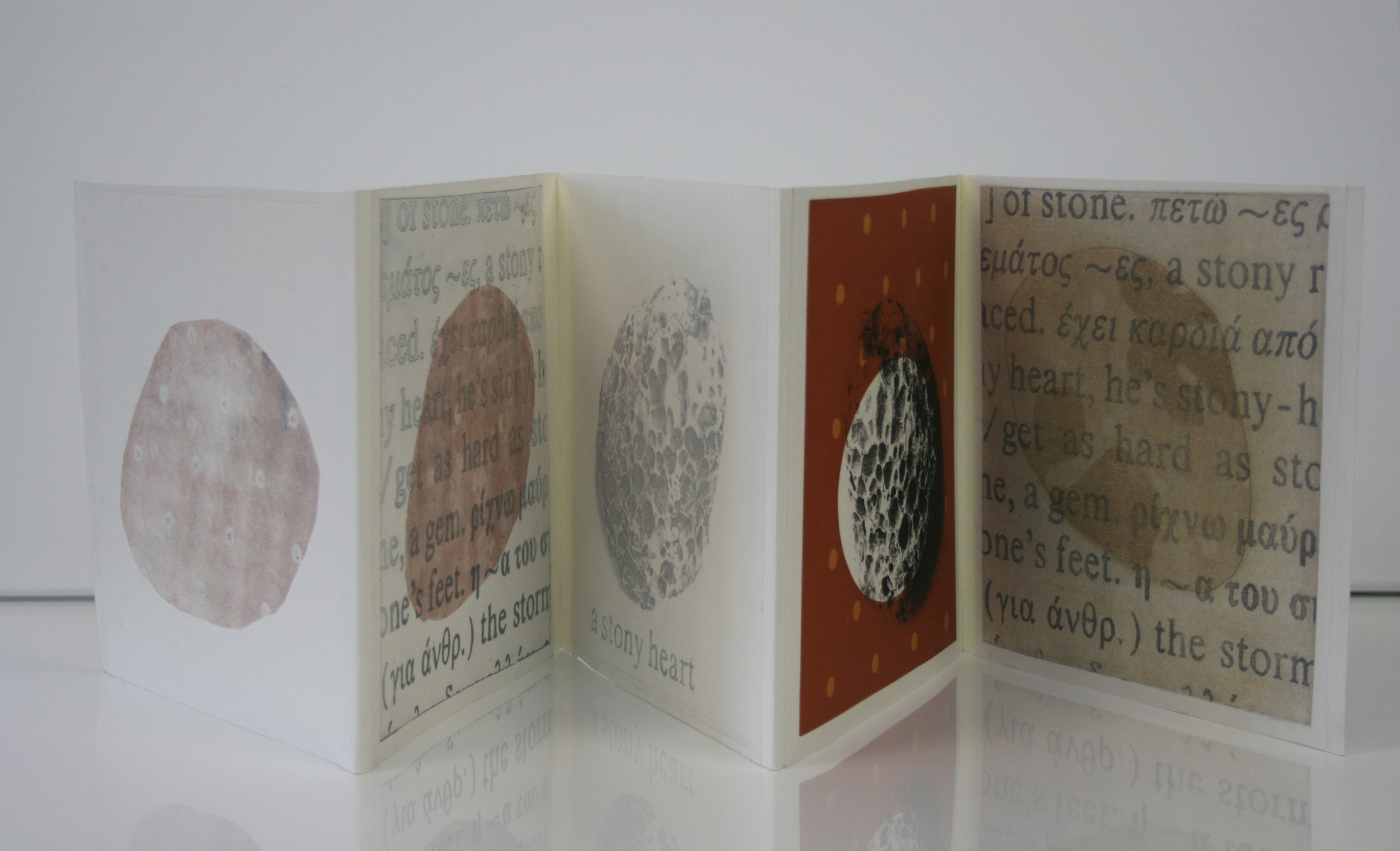 Leporello, combinatie van blinddruk, foto-ets en linodruk. Zonder cover, op zich zelf staand. Thema is telkens dezelfde steen, als wezen en universum. Klein en groots tegelijk.