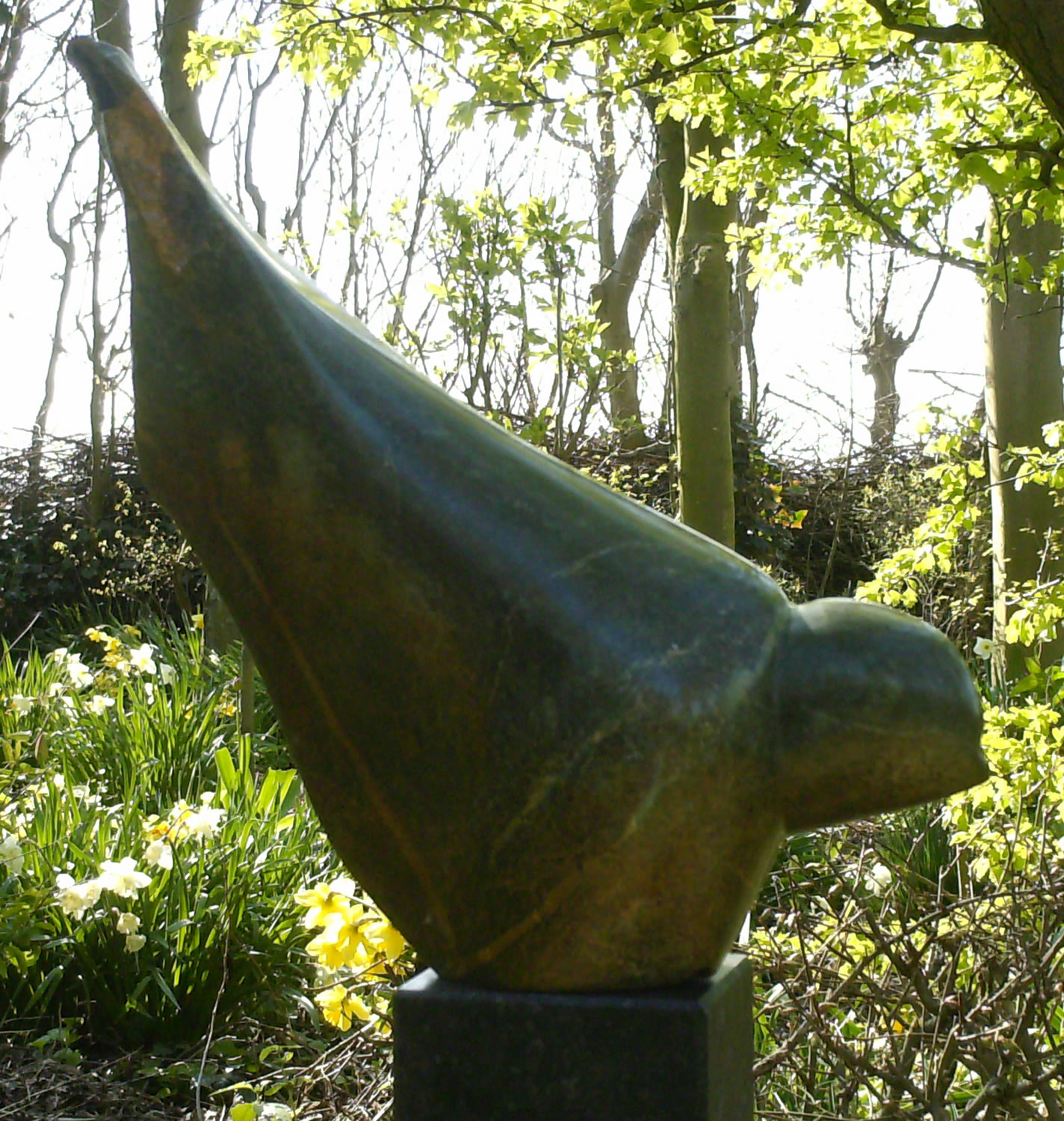 Buitenbeeld, vogel van serpentijn op hardstenen sokkel; totale hoogte 120 cm.