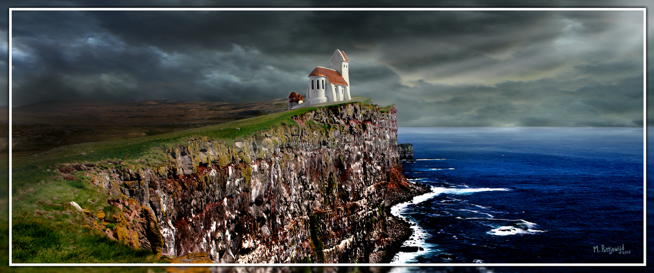 Het gemaakte klei beeld gefotografeerd en digitaal in een samengesteld landschap van meerdere foto's geplaatst. Digitale print op alubond