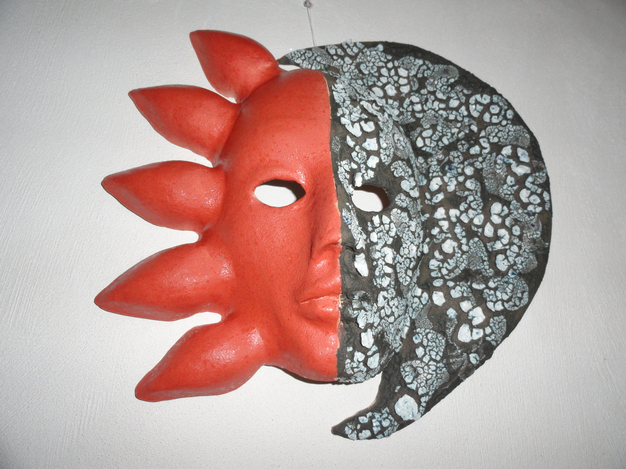 Maske die herrezen is uit de vlamenzee. De ene helft is met satijn rode glazuur gespoten en de andere helf is bewerkt met terug trekkende glazuur met als effect van vulcanisch aandoende aanzicht.