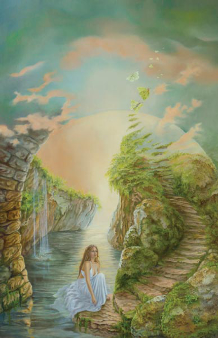 Ze komt uit het water dat het onbewuste kan symboliseren. Ze bezint zich op hoe verder te gaan, de trap op om daarboven te transformeren zoals de vlinders?