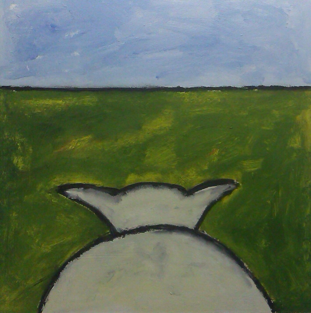 Het schaap kijkt naar niets. Of ziet hij toch alles? 82 x 82 cm, incl. witte 10 cm brede lijst.