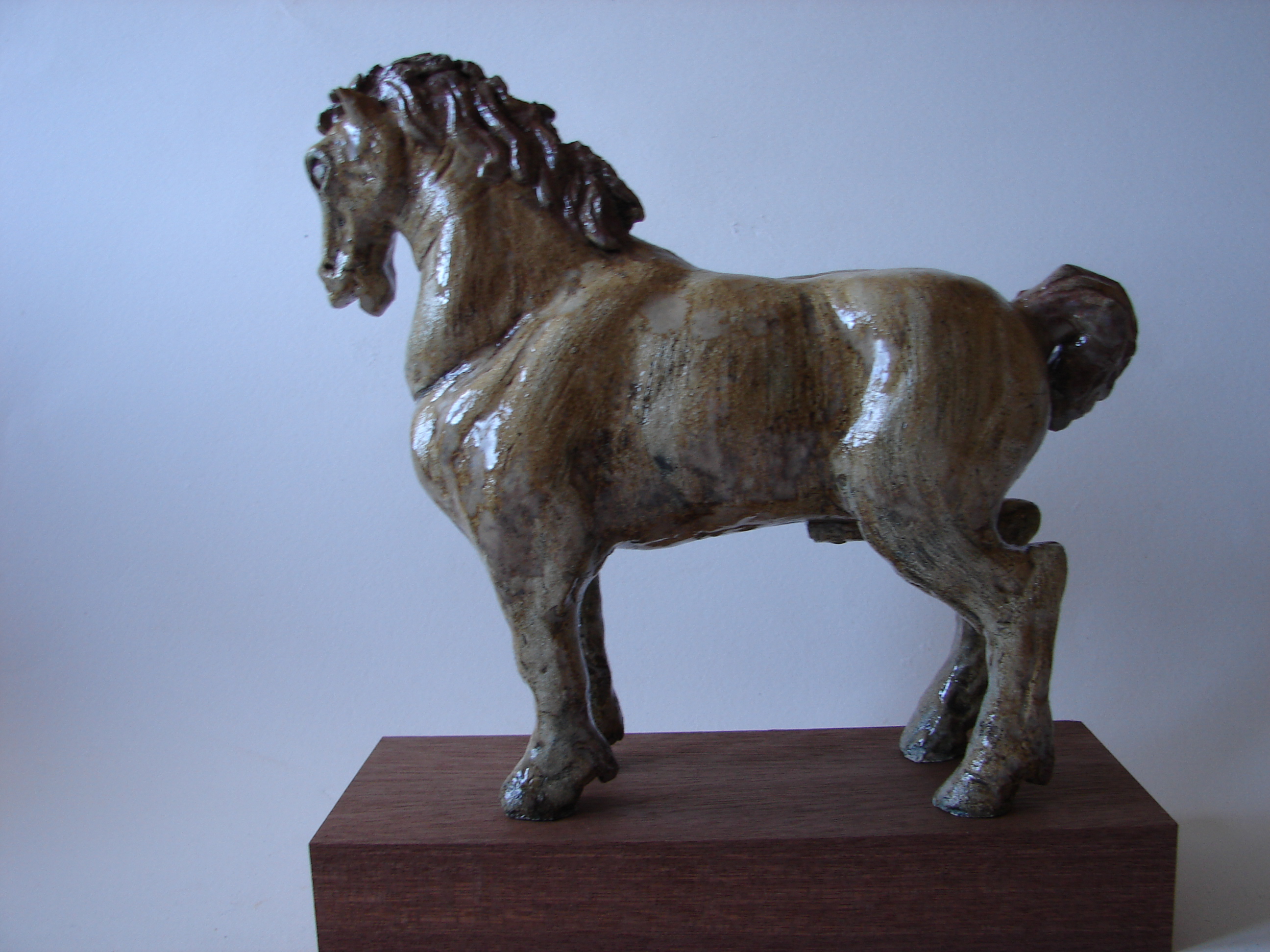 Dit paard is geïnspireerd op de werken van de graveur (en later schilder) Hendrick Goltzius (1558-1617). Goltzius maakte paarden onsterfelijk: imposant en bovenmatig gespierd, ranke korte benen, beweeglijke monden, extreem gebogen hoofden, weelderig sierlijke manen en staarten vol versieringen. Zelfs paarden in gevecht voorzag hij van vlechtjes in hun staart en manen, of wapperende strikken en lintjes. Voor het werken in keramiek zijn epaalde technieken van Goltzius vertaald. Graveurs werken met vele fijne lijnjes en krassen om diepte en reliëf aan te geven. Hier is dat gedaan middels het trekken van veel dunne voren, die met mangaan zijn ingewassen zodat er onder het glazuur donkere lijntjes te zien zijn. Dit paard is versierd met kleine pompoenen in de manen, als tekenen van ijdelheid. Goltzius werkte als graveur in zwart-wit en daarom is het paard met een soort goud-grijs glazuur afgewerkt, met kleurkristallen in rood en paars op staart en manen.