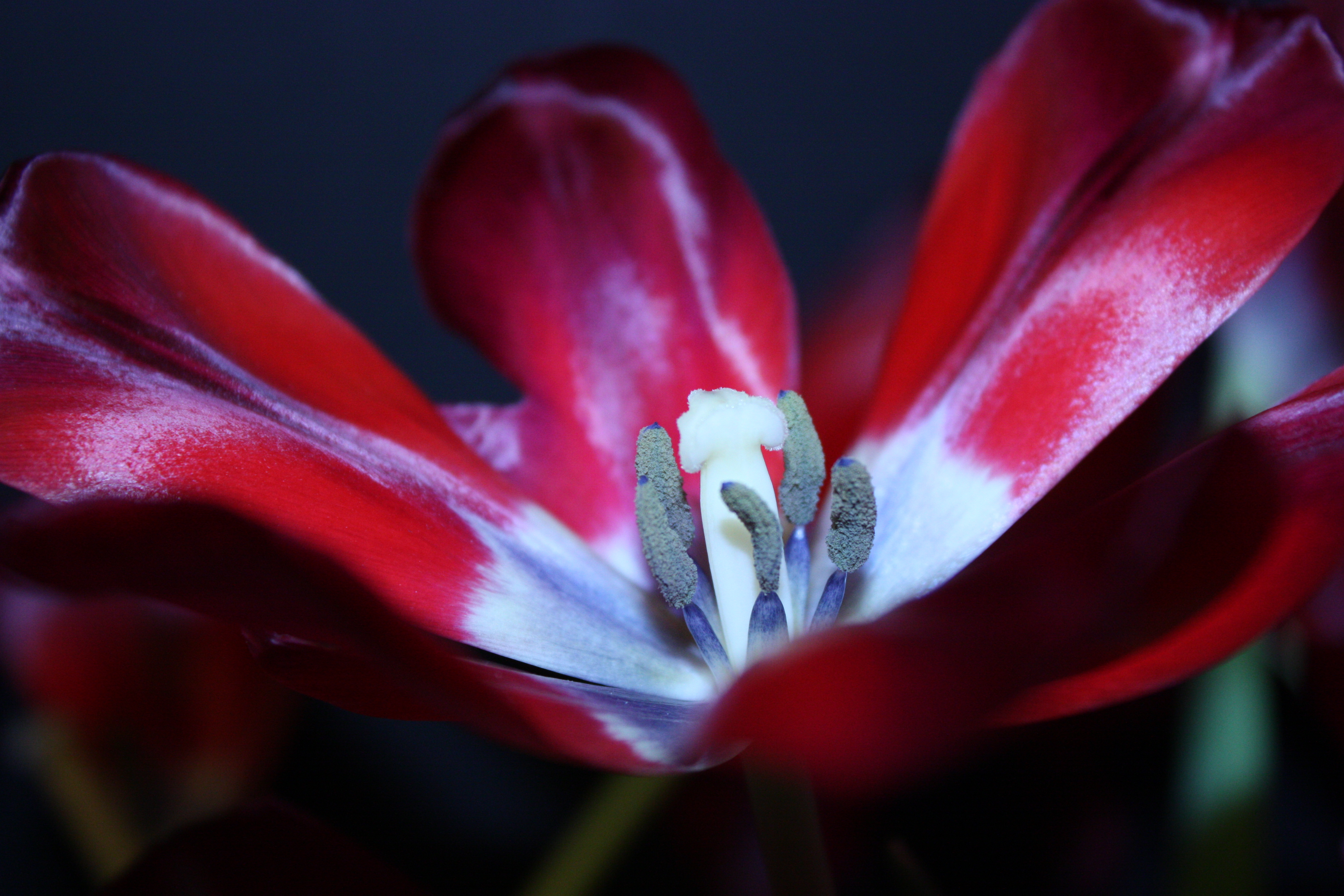Tulp met zwart blauwe achtergrond Vanaf zondag 4 augustus te zien in Fluwels Tulpenland op de expositie Kunst in de Kas in Sint Maartenszee