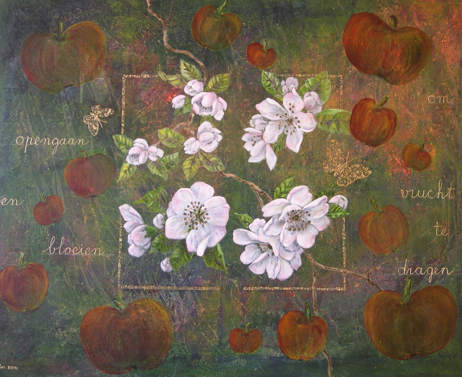 Van knop tot vrucht. Opengaan en bloeien om vrucht te dragen. Acrylschildering met collage van stof. Compleet in blankhouten baklijst en gevernist.