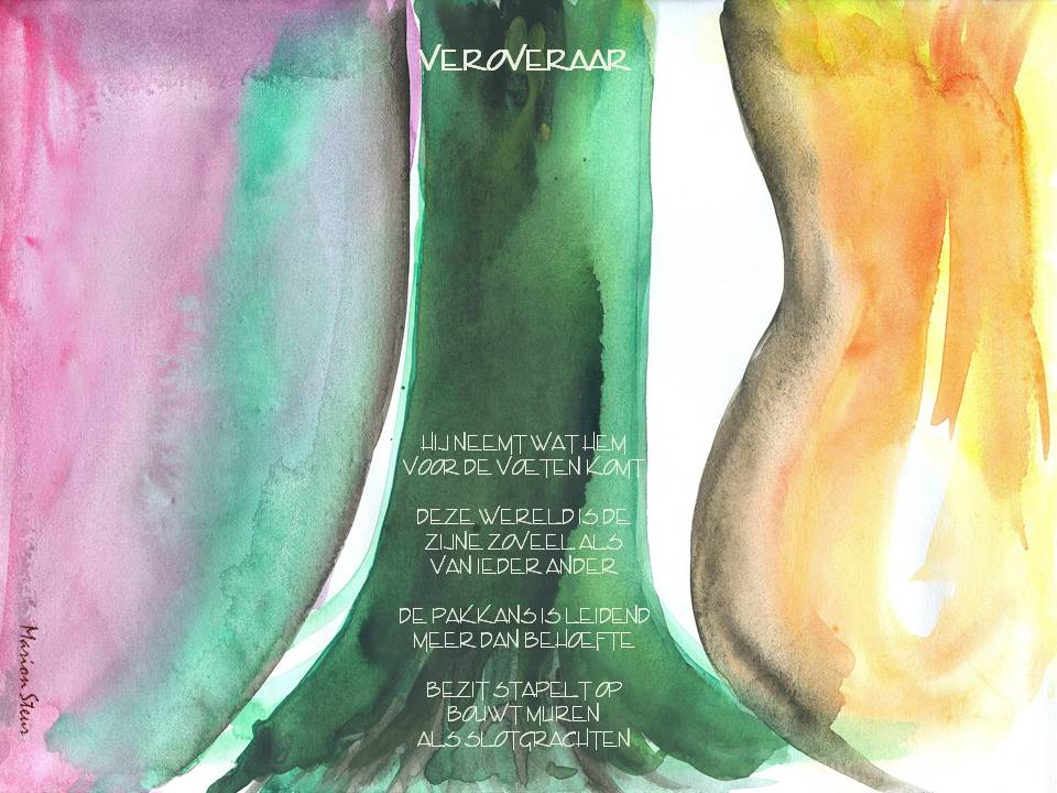 Veroveraar hij neemt wat hem voor de voeten komt deze wereld is de zijne zoveel als van ieder ander de pakkans is leidend meer dan behoefte bezit stapelt op bouwt muren als slotgrachten Gedicht op digitale versie van aquarel. Print van 40 x 60 cm op canvas. Andere formaten in overleg. Oplage 5 stuks.