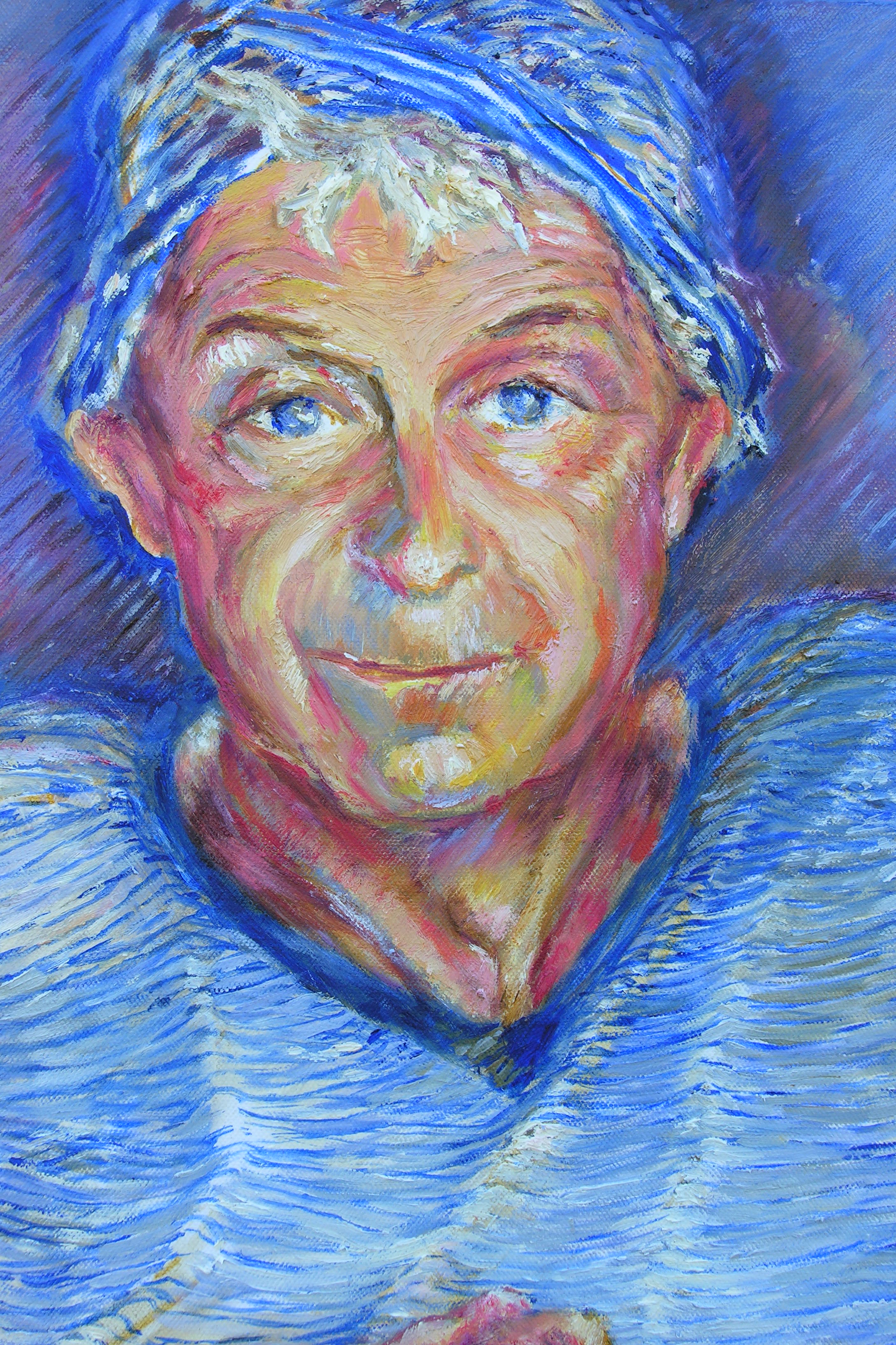 Het portret van Jan V, 65 jaar oud, is opgebouwd uit verschillende lagen olieverf. Het T-shirt en de muts zijn zo geschilderd dat het wat beweegt. Niet te veel, genoeg om dit intieme portret extra levendig te maken. Jan V. houdt van zijn boot op het water. Het t-shirt is een zeemansshirt in zeemanskleuren. De bewegelijkheid is tot stand gekomen na bestudering van de wetten van de perceptuele illusies, ook zoals ze zijn toegepast door pop-art kunstenaars. De bewegelijkehid is heel rustig gehouden om te voorkomen dat de persoonlijkheid van de geportretteerde te veel overheerst zou worden.