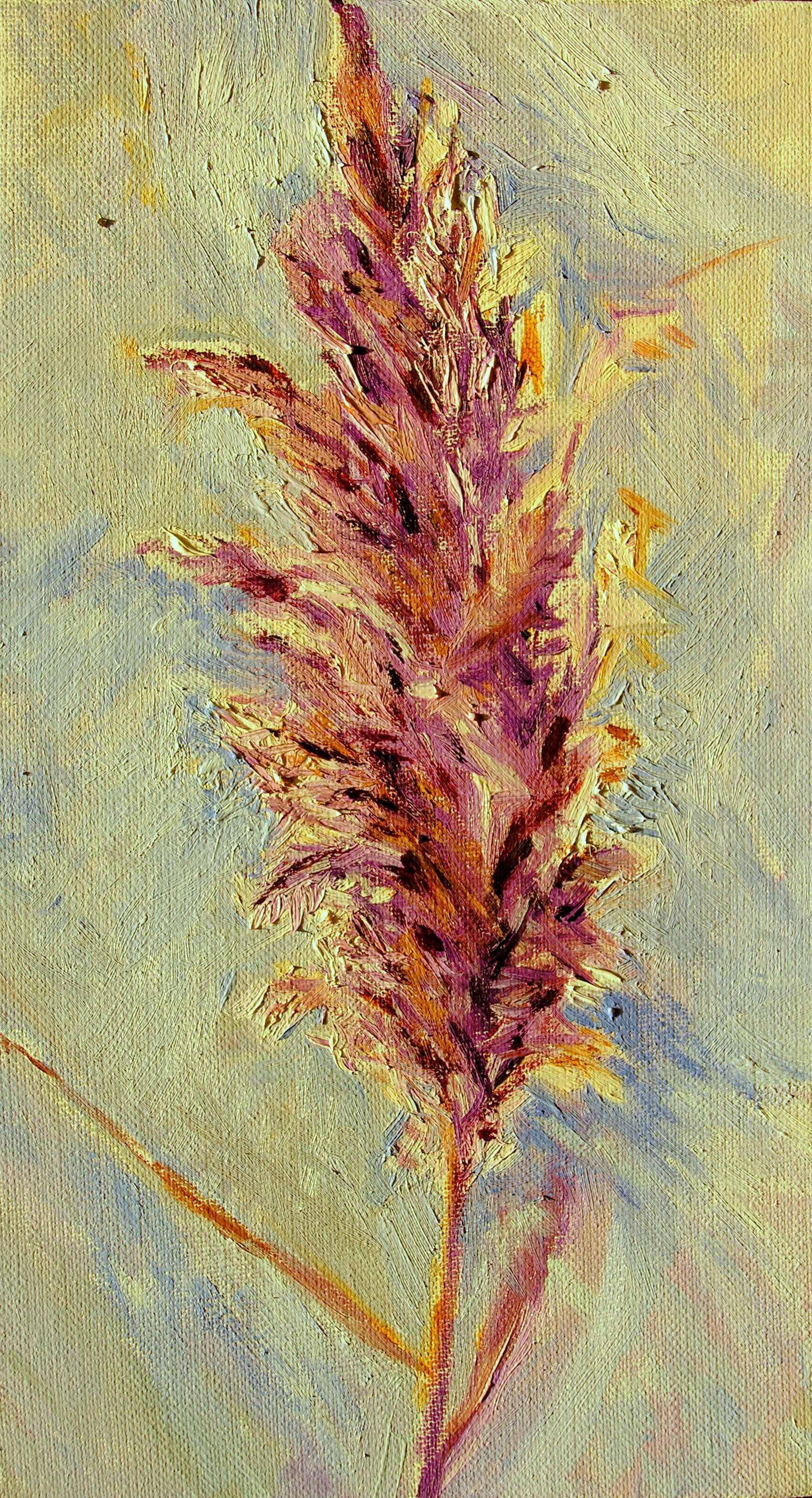 Studie van rietpluim. Was steeds maar met fijne structuren bezig. Fijne structuren zitten er voldoende in de rietpluim. Zeker als de pluim het tegenlicht opvangt. Hoe moeilijk is het om de vorm, de structuren en het licht tegelijkertijd te vangen. Rietpluim 2: De fijne haren van de rietpluim vangen het licht