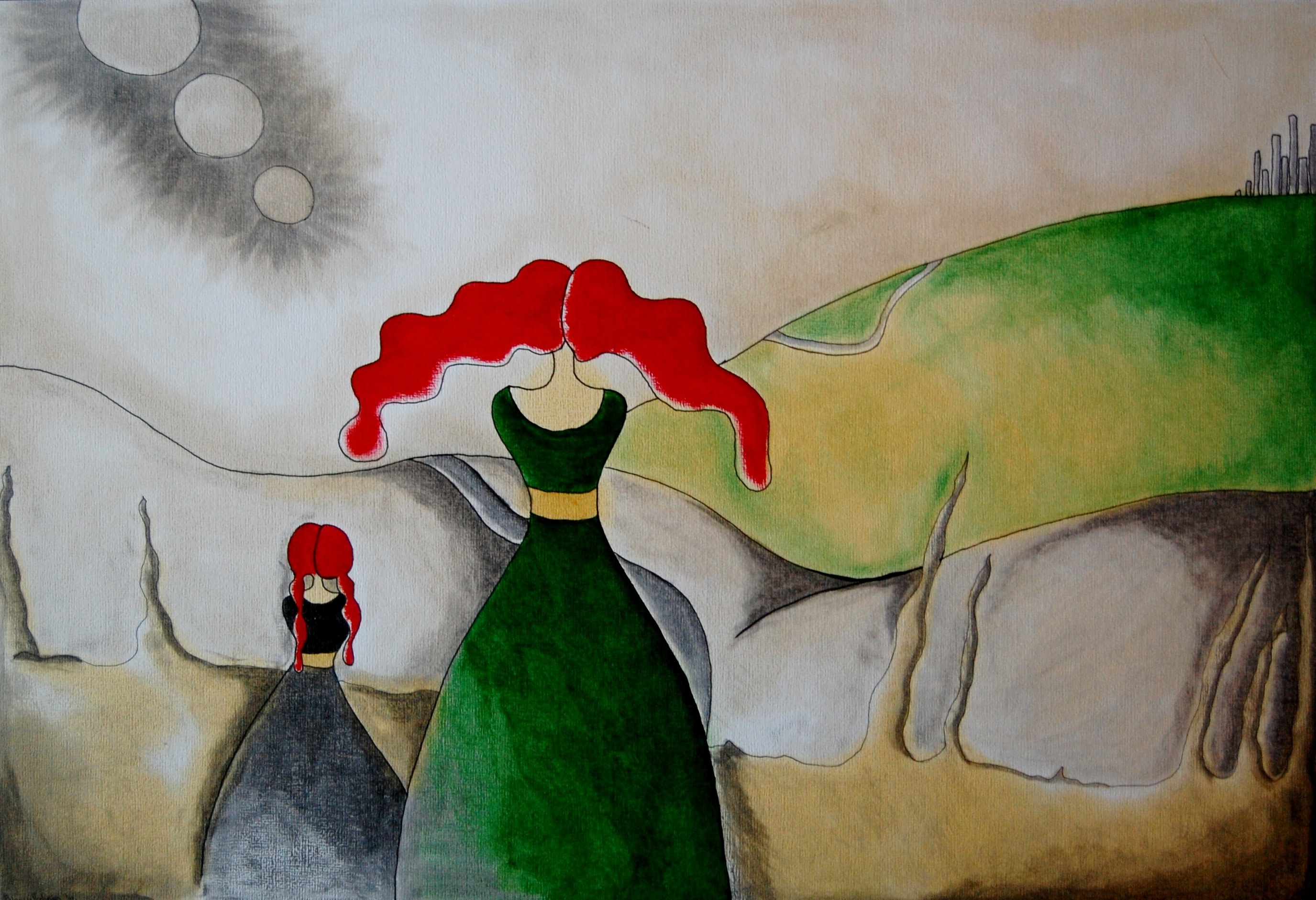 Het verhaal achter dit schilderij is dat het kleine meisje vlak na haar geboorte is ontvoerd en sindsdien is verloren. De moeder heeft haar een korte tijd geleden terug gevonden en brengt haar nu naar huis. Ze leven in een andere wereld. Waar het bijna overal verdorven dood en gevaarlijk is behalve op een bepaalde plek. Die plek zie je op de groene heuvel. Ook heb je in deze wereld drie zonnen die grauw licht uitstralen en geen blauwe lucht.