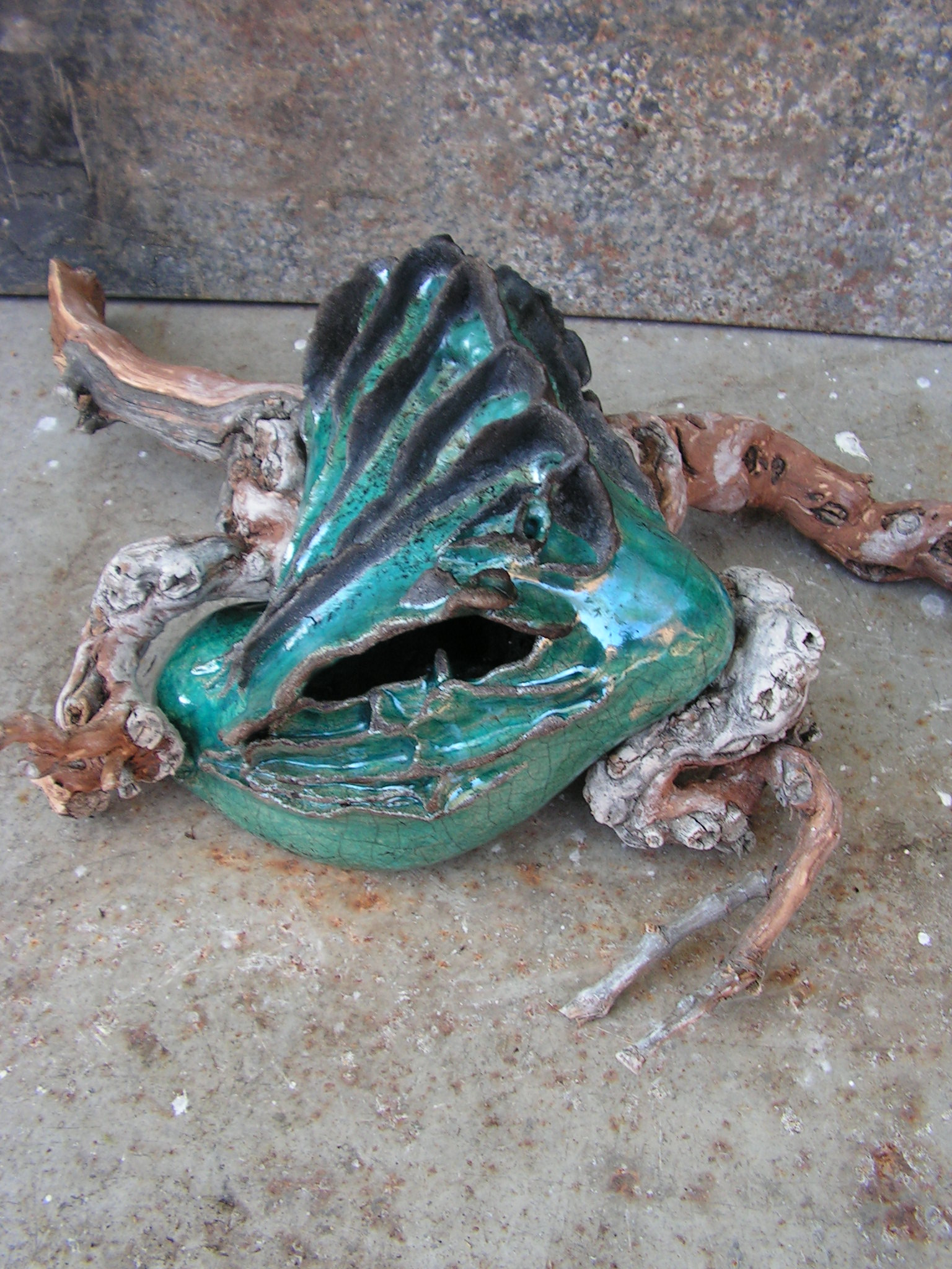 Dit object heeft een naturlijke vorm Deze wordt gedragen door een wijntak Raku gestookt.