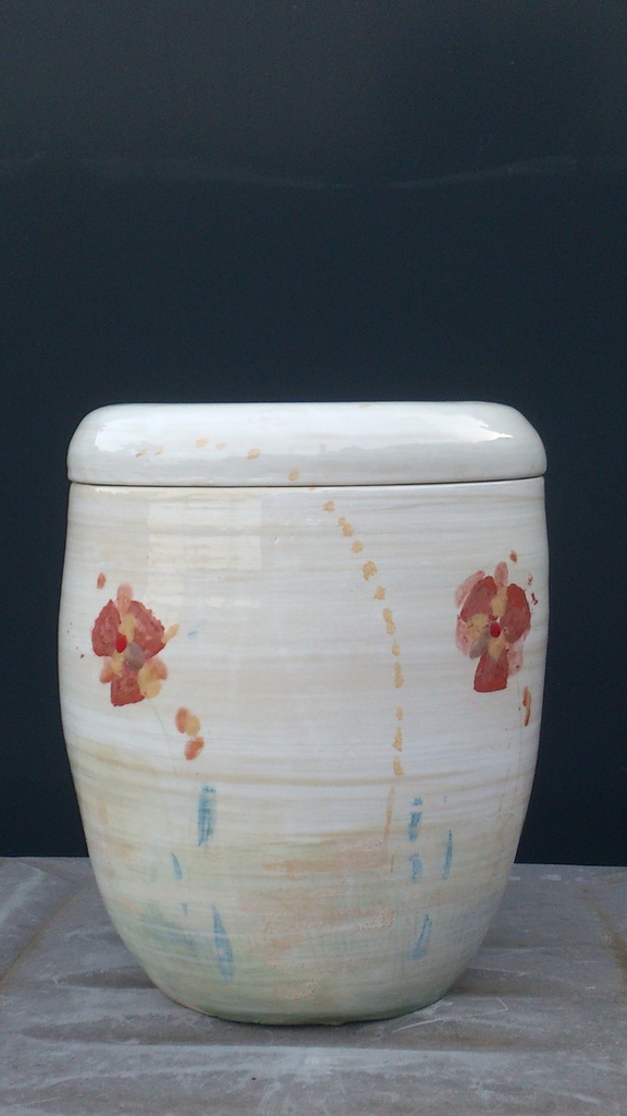 Aardewerk urn met bloemen, engobes en porseleinslib