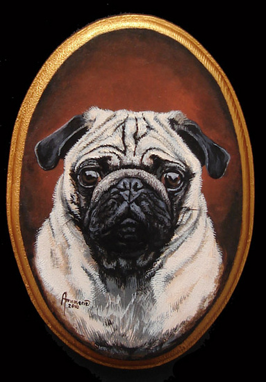 Klein portret van een jong Mopshondje reu op een ovalen houten paneeltje.