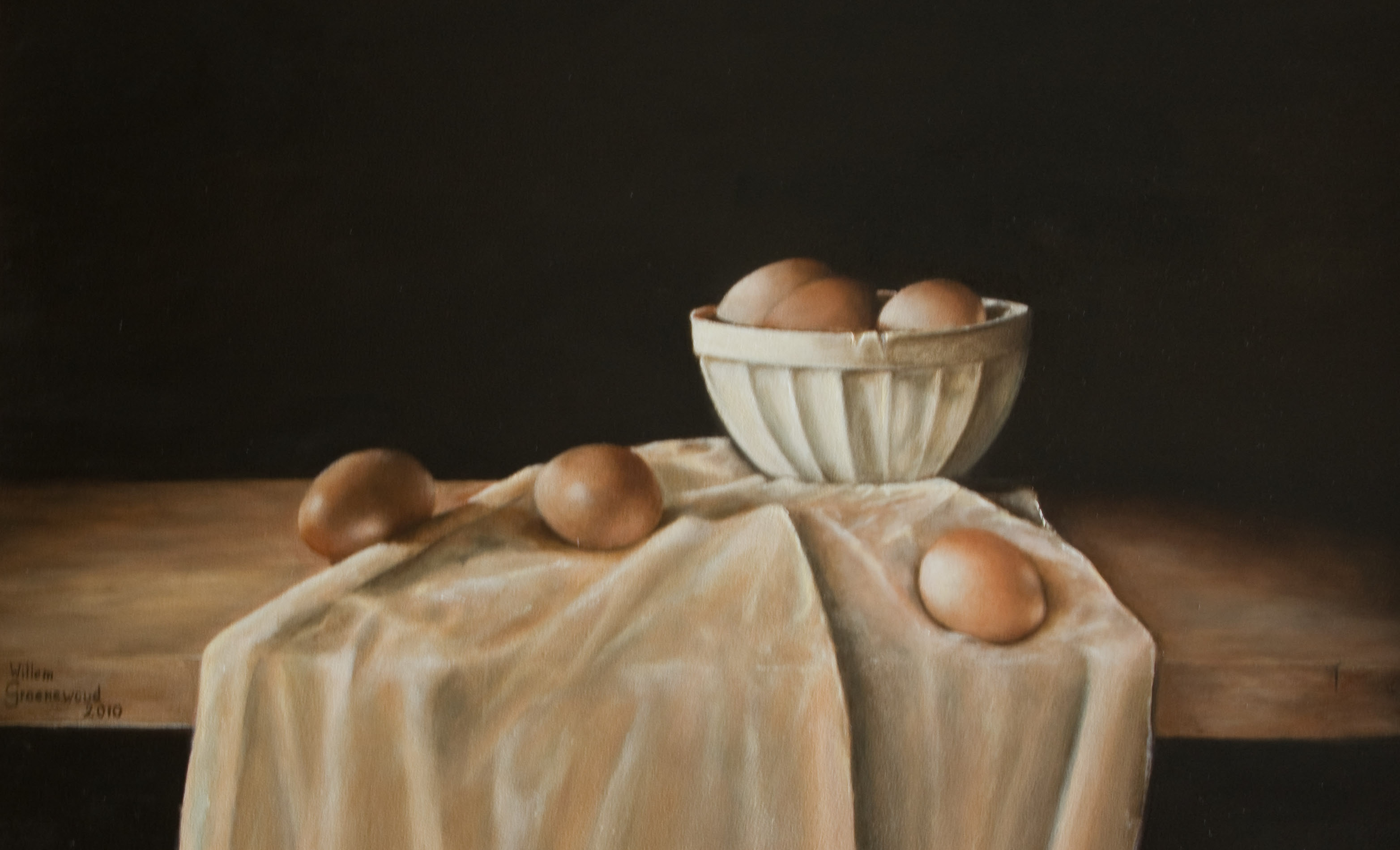 Een oud schaaltje, wat eieren en een doek. Olieverf op paneel, met lijst.