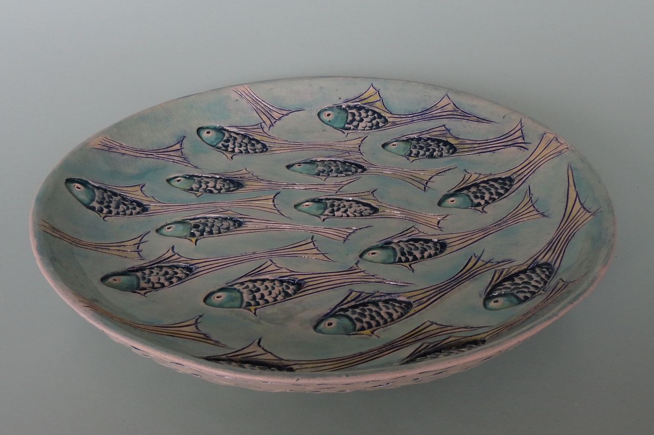 grote ronde platte schaal met vissenmotief in relief