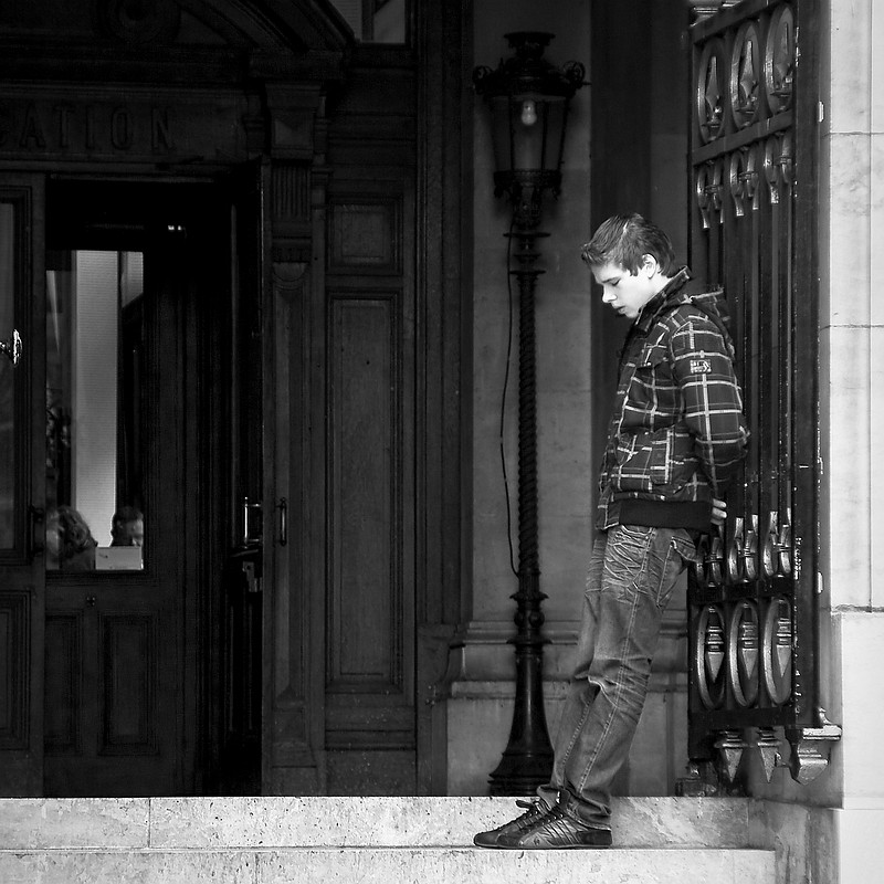 Wachtende mannen. Je komt ze overal tegen. Deze stond bij de ingang van L'Opera te Parijs