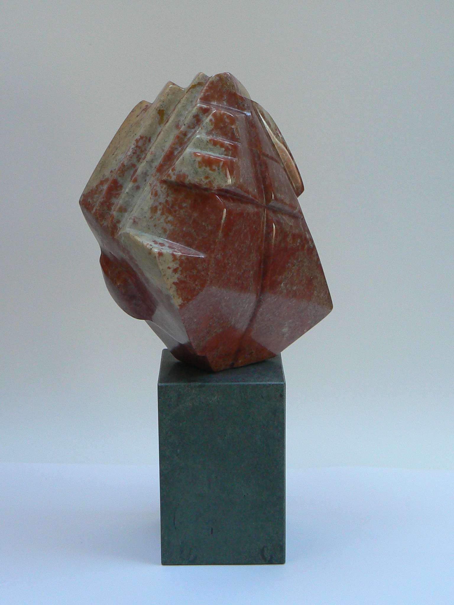 Een in rode Indiase speksteen uitgevoerd beeld met rechte lijnen. (de maten zijn zonder de hoge sokkel!).