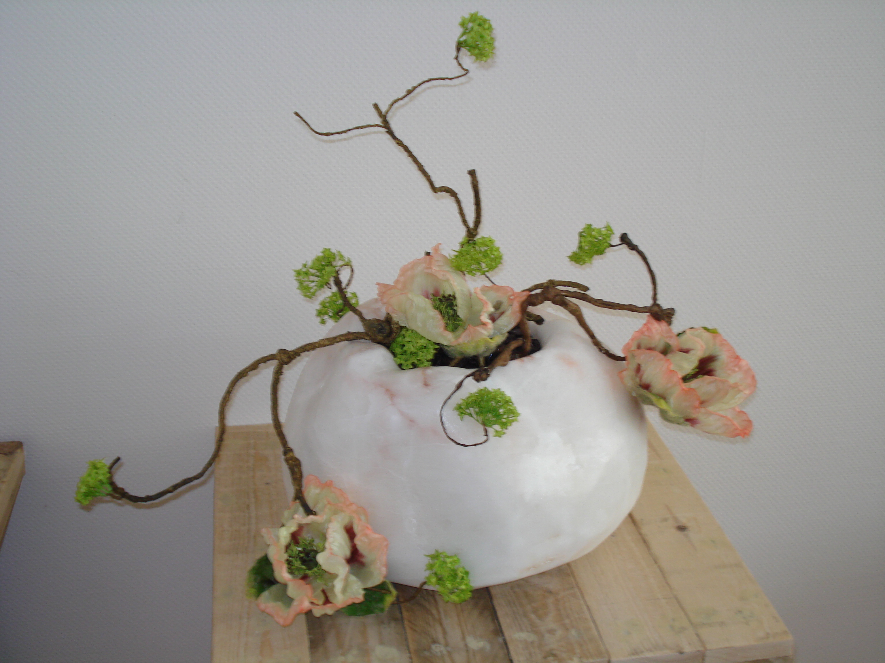 Deze vaas is opgemaakt met kunst bloemen.
