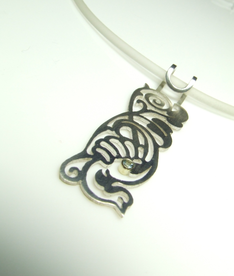 Handgezaagde zilveren hanger met in goud gevatte aquamarijn. De hanger hangt aan een collier van transparant rubber met een zilveren sluiting. Uniek exemplaar! Vanwege de waarde wordt kunt u de hanger afhalen of wordt hij aangetekend verzonden via TNT.