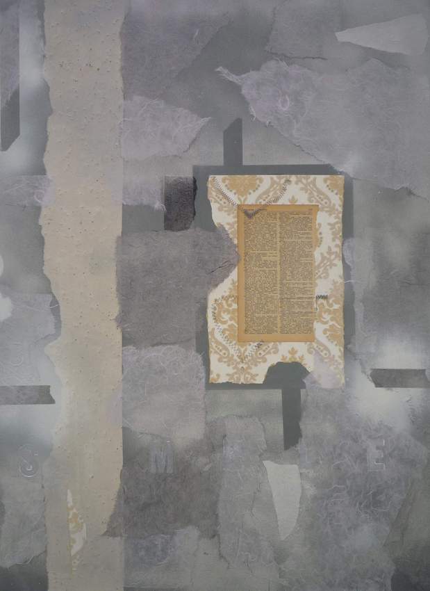 Collage van oud behang en papier op doek. Woordenboekpagina met het woord Simple. Vormt een tweeluik met het schilderij &Pure. Samen Pure&Simple.