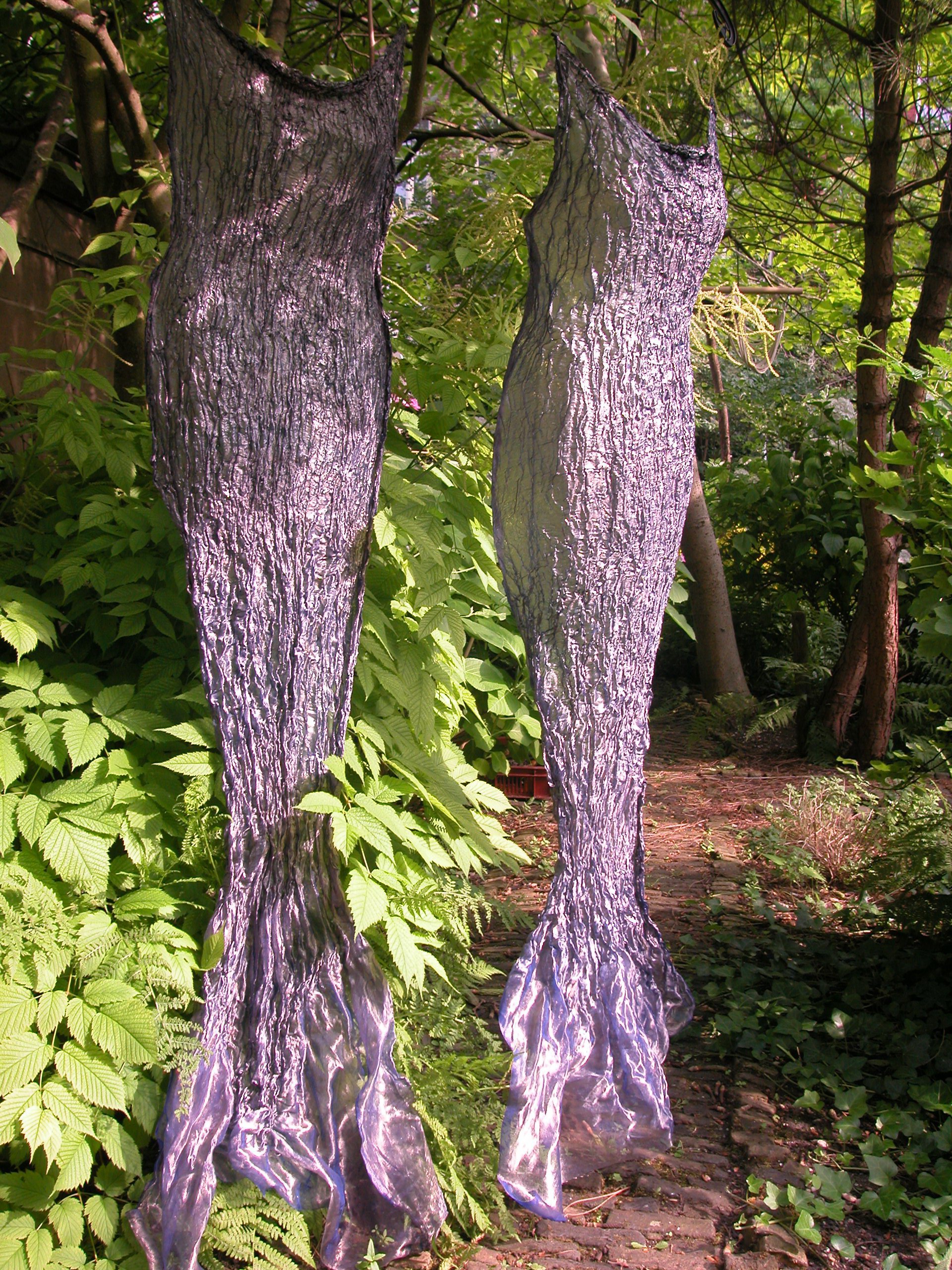 Semi-transparant werk. Materiaal: verhard metaalzijde. Ik heb er een aantal gemaakt, ieder net anders, in verschillende 'non-kleuren', vage onbestemde tinten. Dit werk komt erg goed tot zijn recht voor een raam, of los in de ruimte. Spelen met licht.