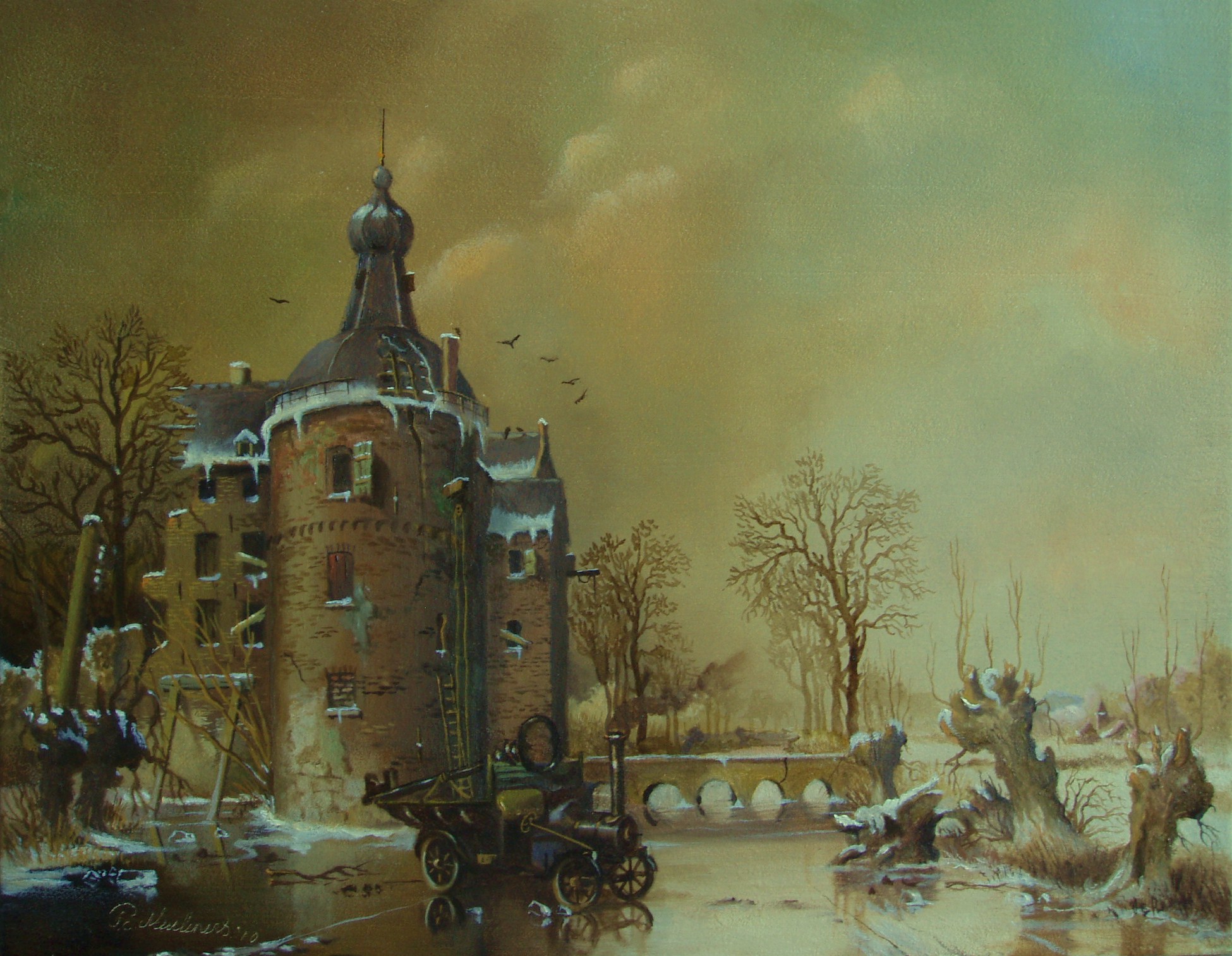 Romantiek Olieverf Winterlandschap Realisme Fantasie Kasteel Sleutel Well Stoomvrachtauto Kerst