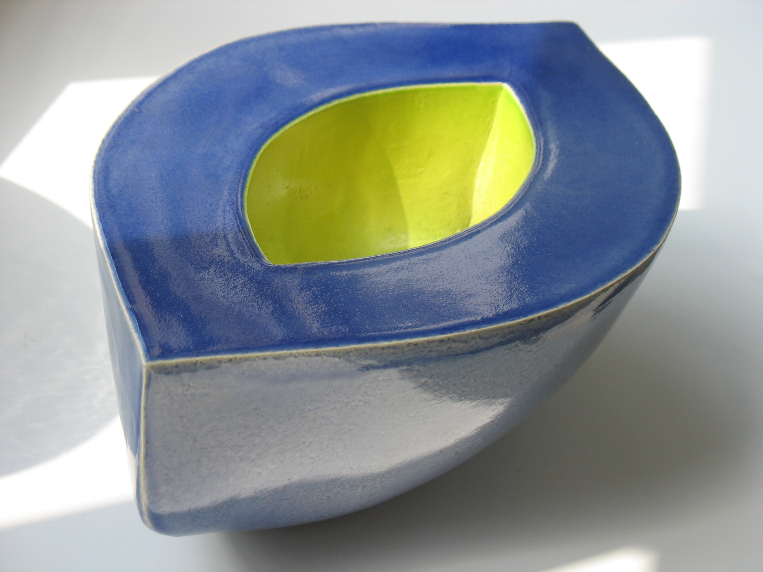 Dubbelwandige schaal, blauw en geelgroen. Handgevormd zonder mal. Geometrisch op zicht en gevoel.