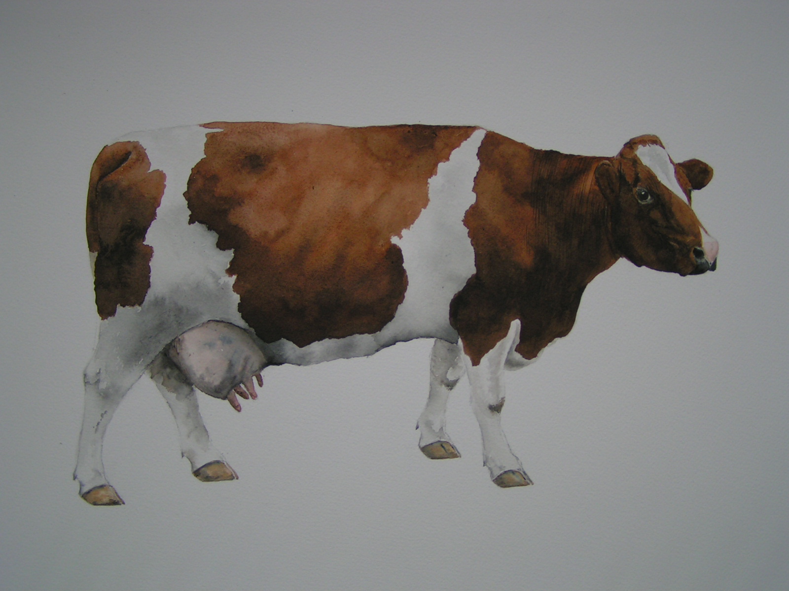 Een prachtige roodbonte koe, waarvan de huid glanst in de zon. Kenmerken: licht, glans, spieren en haar. Alle prijzen van aquarellen zijn inclusief de lijst en passepartout.