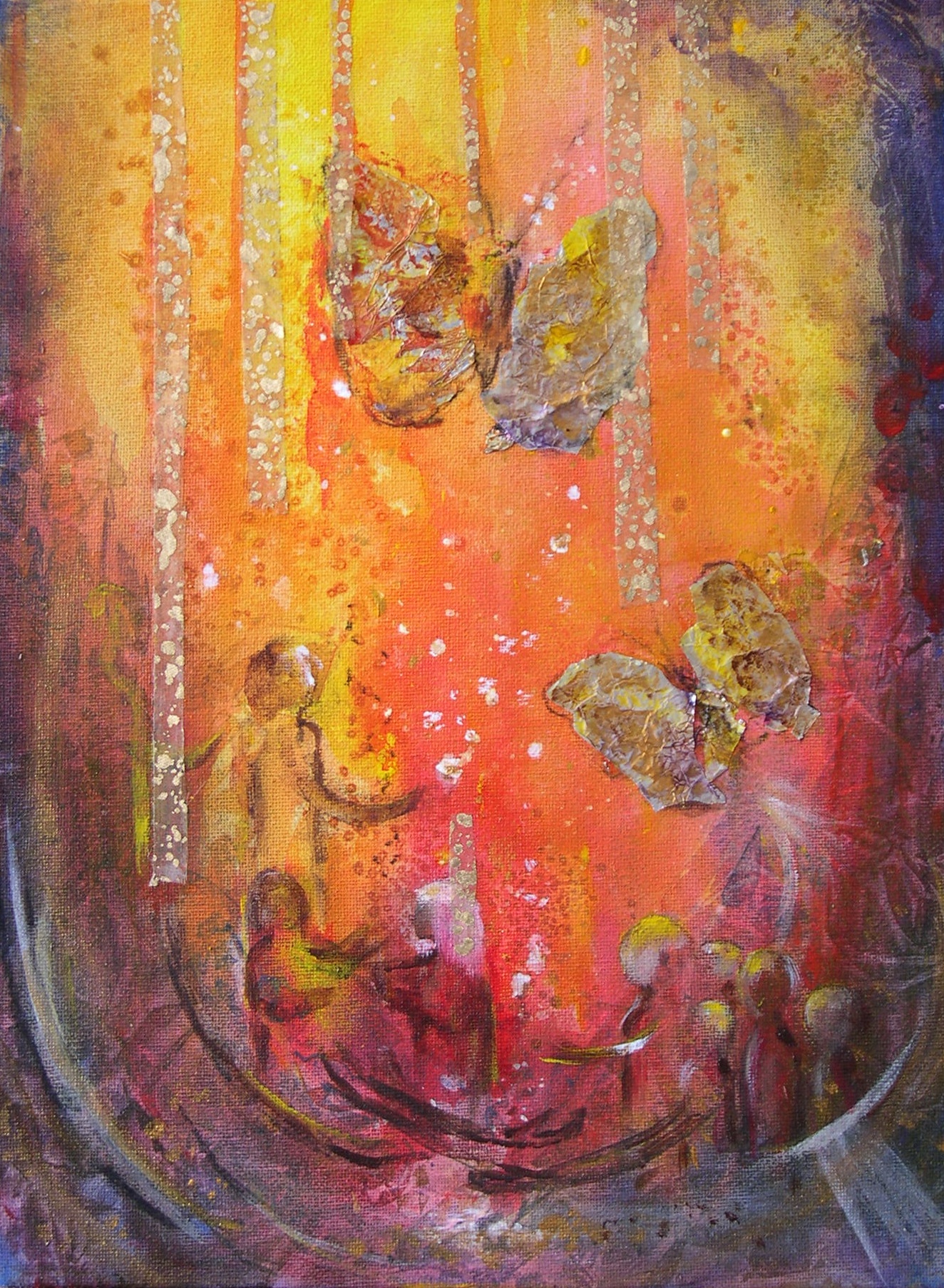 Ontvangen van gaven en zegeningen in je leven. Neem ze aan en geef ze door. Er is zilverfolie en stof met goudopdruk in verwerkt. Ingelijst in zwarthouten baklijst en gevernist.