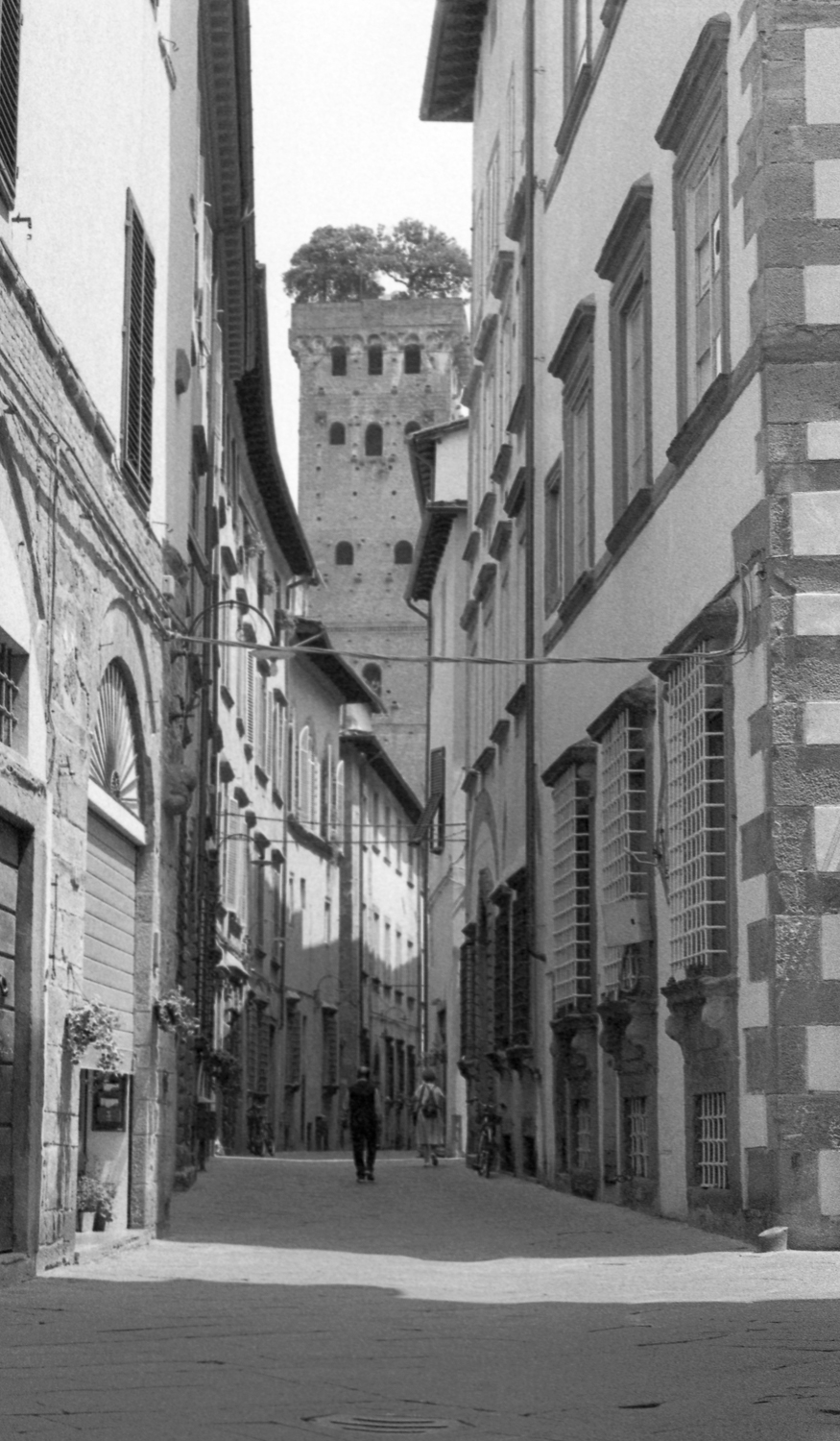 Twee wandelaars in een straat in de stad Lucca in Toscane, Italië Foto 4 uit de serie "Italiaanse straten" Oplage: 5 stuks Afdruk op dibond achter acryl glas - z/w foto in een zwart kader (zwarte kader is 6cm aan boven- en onderkant, 6cm links en rechts). De genoemde afmeting (30x45cm) is inclusief het zwarte kader. Achter de foto zit een aluminium u-profiel om het werk op te hangen.